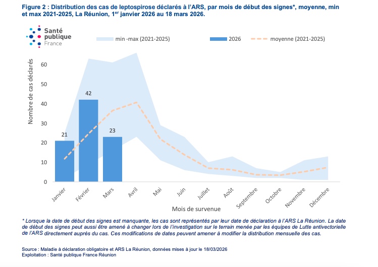 Dans le cadre des maladie à déclaration obligatoire, 86 cas de leptospirose ont été déclarés à l’ARS (soit 11 de plus qu’en S-1) entre le 1er janvier et le 18 mars 2026.