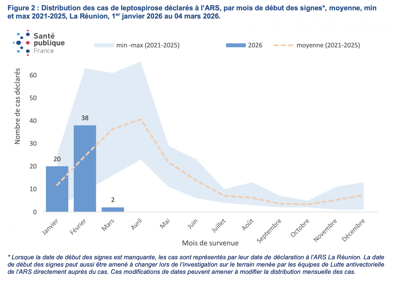 Le nombre de cas survenus en janvier 2026 (n=20) et en février (n=38) étaient supérieur à la moyenne de 2021-2025.