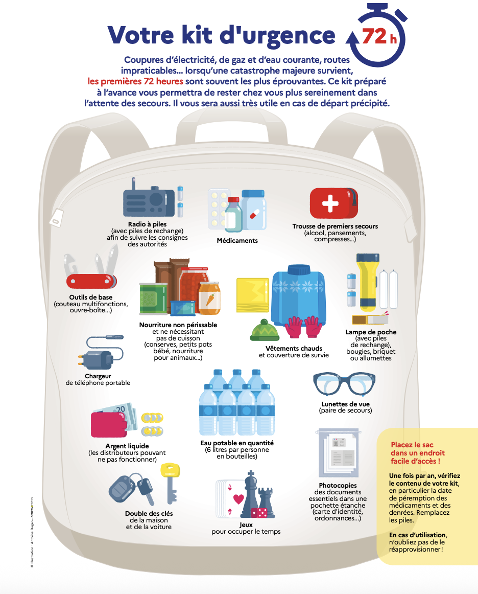 Le principe repose sur quatre fondements : boire et manger, avoir chaud et se soigner. Le document recommande ainsi de stocker six litres d'eau par personne, ainsi que de la nourriture non périssable et utilisable sans cuisson. Autres fournitures : une trousse de premiers secours, des médicaments, une radio à piles. Ou encore de l'argent liquide et des photocopies de ses documents d'identité.