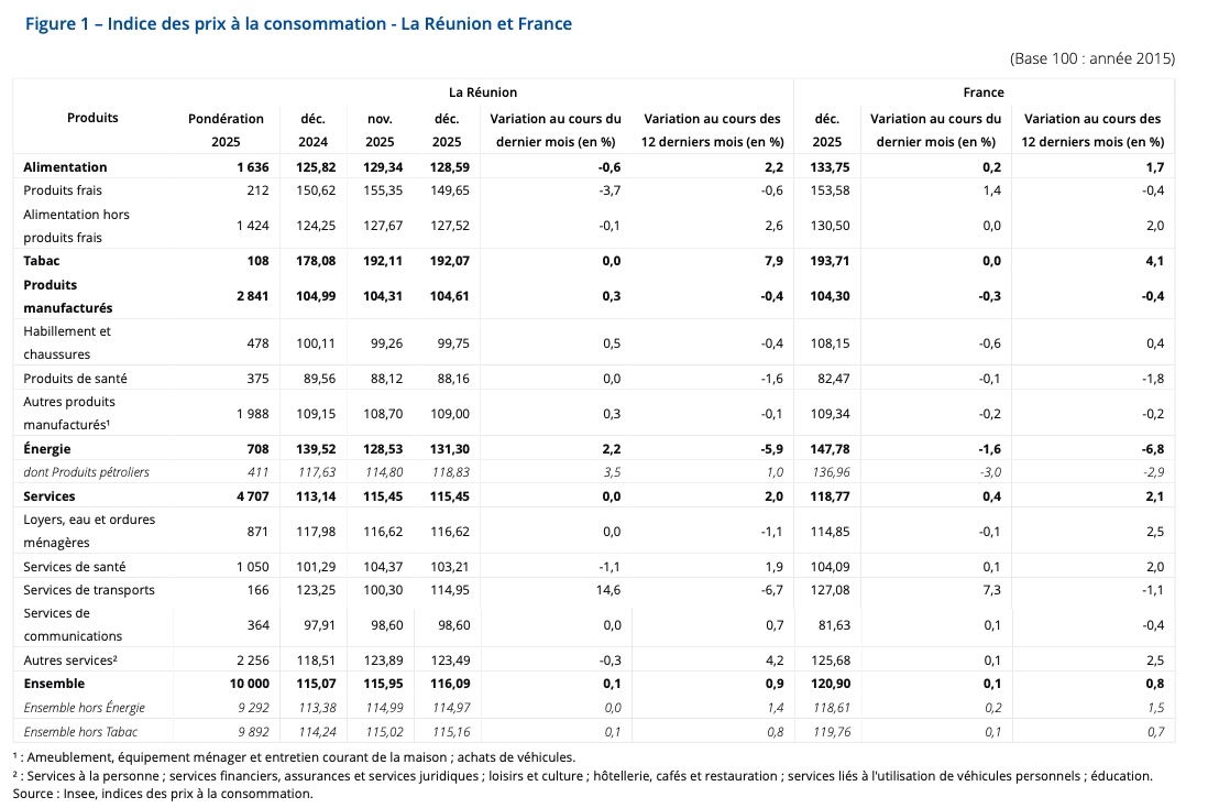 - Sur un an, entre décembre 2024 et décembre 2025, les prix augmentent de 0,9 % à La Réunion -