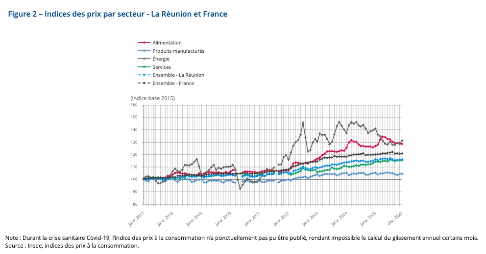 En décembre 2025, par rapport au mois de novembre, l’indice des prix à la consommation est stable à La Réunion après une augmentation de 0,2 % en novembre et une stabilité en octobre. En décembre, les prix de l’énergie repartent à la hausse et ceux des produits manufacturés continuent d’augmenter. Les prix des services et du tabac sont de nouveau stables, ceux de l’alimentation baissent après deux mois de stabilité.