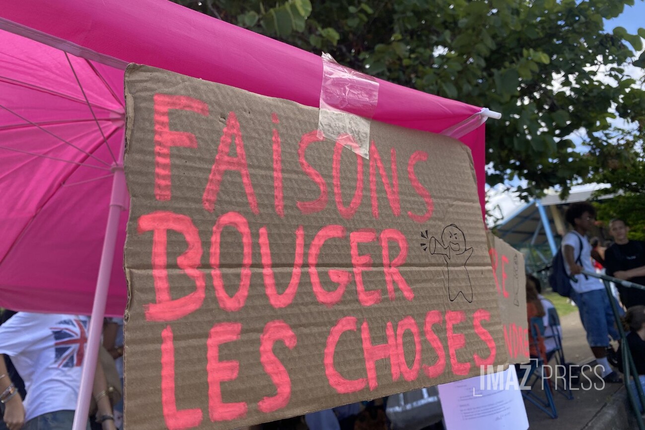 "Obligés de faire des pancartes pour être écoutés", c’est ce qu’on peut lire sur le morceau de carton que tient une lycéenne devant son établissement, à Stella dans les hauts de Saint-Leu.