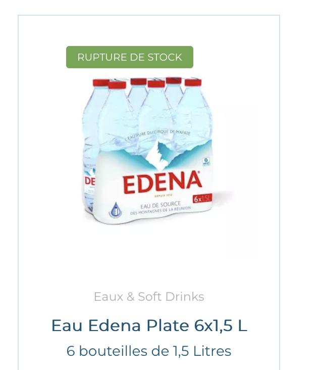 Sur le site d'Edena, l'eau plate, comme l'eau gazeuse de la marque Volcanik sont en rupture. Regardez.