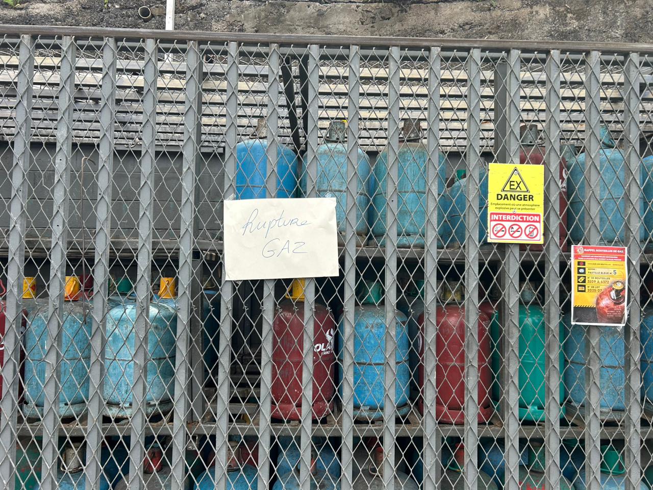 Dans cette station-service de Saint-Leu, un mot sur les grandes grilles qui protègent les bouteilles de gaz indique : "rupture de gaz".
