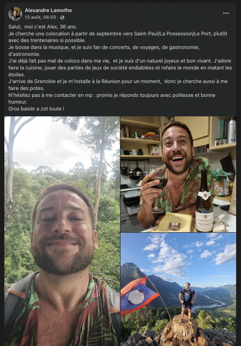 Lesquels seront confortés dans ce sentiment par les saluations de d'Alexandre Lamothe à la fin de son post sur la recherche d'une colocation. "Gros baisèr a zot toute !" s'exclame qui dès octobre aura la charge de défendre la langue créole, la musique et les artistes de La Réunion...