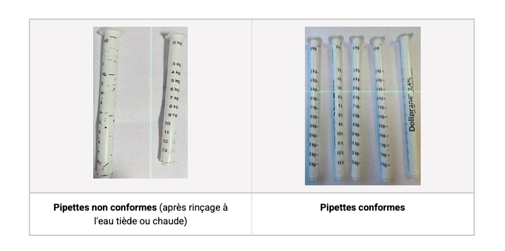 L’effacement des graduations sur la pipette peut entraîner des erreurs sur la quantité de paracétamol administrée à l’enfant. Dans certains cas, un surdosage en paracétamol peut notamment causer des lésions du foie. Ce risque, bien que faible, existe chez les bébés et les jeunes enfants chez lesquels une atteinte du foie peut survenir en cas de prises répétées à des doses trop élevées.