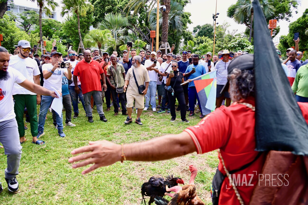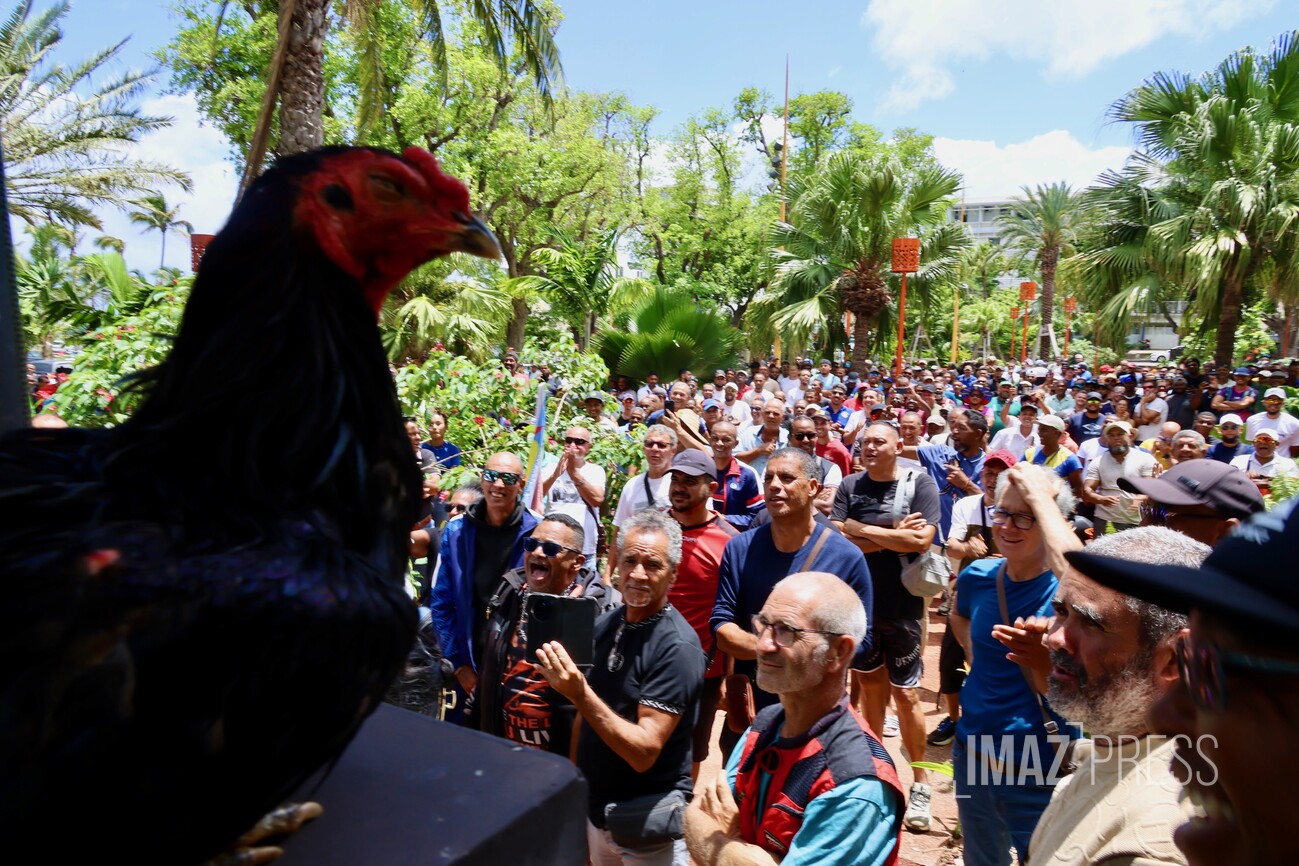 Ce mercredi 17 décembre 2025, ils sont près de 400 personnes à s'être rassemblées devant la préfecture de La Réunion pour défendre les traditions locales. Batailleurs coq, pêcheurs, chasseurs... tous sont présents pour défendre ce qui fait les traditions réunionnaises. Cet appel a été lancé après l’interdiction de tout mouvement d’oiseaux domestiques ou de faune sauvage, et donc des batay kok, après la découverte du virus de la maladie de Newcastle dans une basse-cour du sud de La Réunion (Photos : rb/www.imazpress.com)