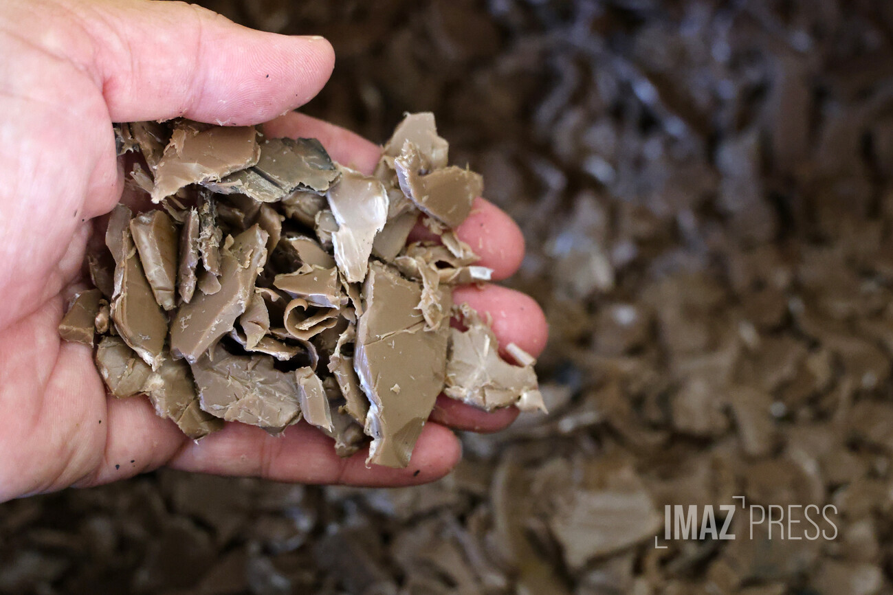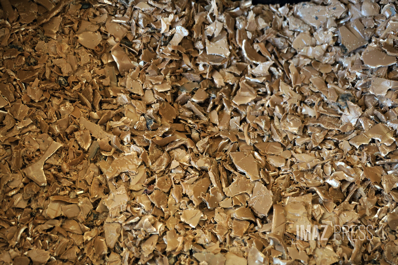 "Ces bacs sont broyés en petits morceaux, pour ensuite être moulés et cuits dans une presse, avant de passer dans une presse froide pour maintenir le tout droit", explique Yannick Settama.