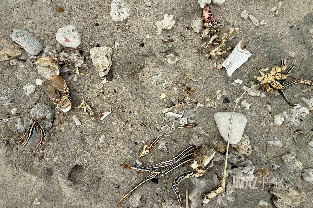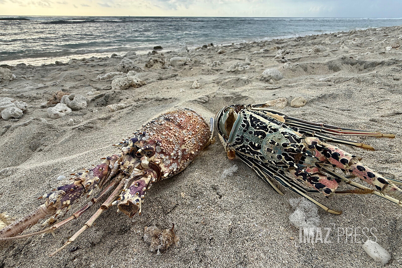 Éparpillées sur la plage des Brisants, des carapaces de langoustes jonchent le sable, parfois presque entières, parfois en morceaux. Des restes de langoustes se retrouvent étonnamment au bord de l’eau. Interrogée, la Réserve naturelle marine de La Réunion avance la piste d’une mue, un phénomène normal, naturel, mais peu connu chez la langouste. (Photo : rb/www.imazpress.com)