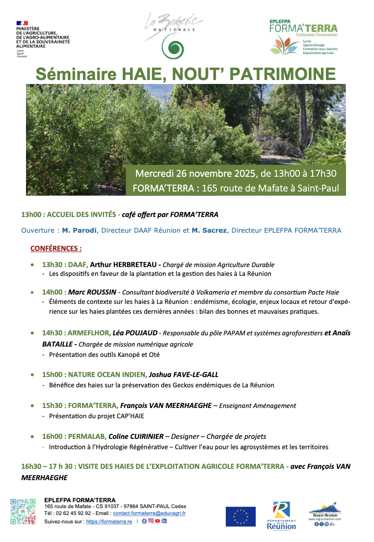 Ce mercredi 26 novembre 2025, de 13h00 à 17h30, Forma'Terra organise séminaire "Haie, Nout'Patrimoine" à Saint-Paul. Cet événement est réservé aux professionnels du monde agricole impliqués dans la gestion ou la valorisation des haies. Nous publions ci-dessous le communiqué (Photo : sly/www.imazpress.com)