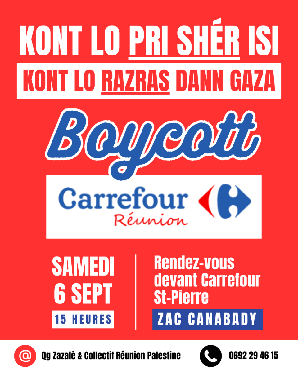Comme il l'a fait précédemment, le Collectif Réunion Palestine appelle à boycotter Carrefour et relayer cet appel à la manifestation. "Le groupe GHB, propriétaire de Carrefour, fait 35% de son chiffre d'affaires à La Réunion. Nos achats c'est notre pouvoir de choix. Si on veut que ça change, il faut nous mobiliser ensemble, rejoignez-nous", insiste les organisateurs.