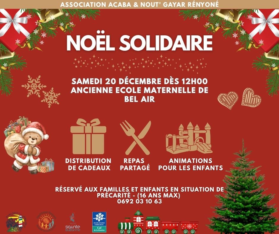 La remise des cadeaux aura lieu lors d’un moment festif et convivial : le samedi 20 décembre à partir de 12h, à l’ancienne école maternelle de Bel-Air à Sainte-Suzanne.
