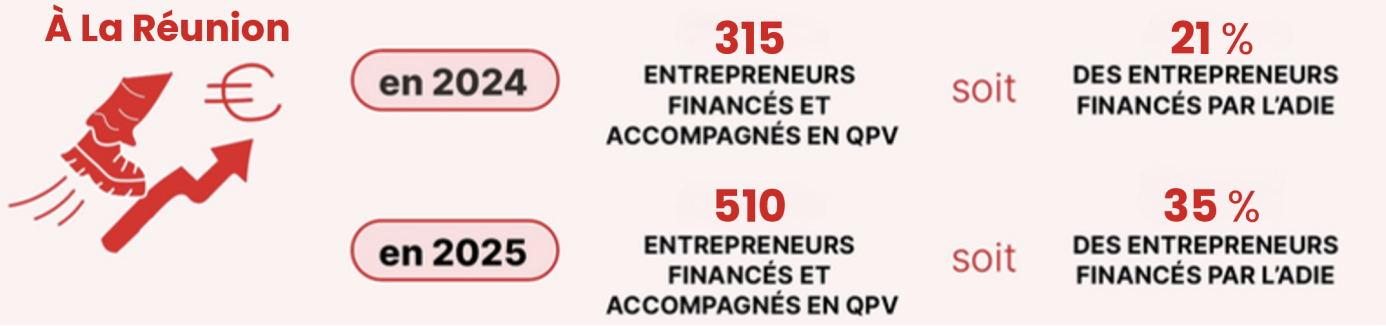 En 2025, plus de 80 % des agences de l'Adie sur l'île sont implantées au cœur des quartiers, renforçant ainsi la proximité avec les porteurs de projets. Cette présence accrue se traduit par une progression continue des créations d'entreprise financées et accompagnées, avec une hausse de 14 % du nombre de clients résidant en QPV sur la dernière année.