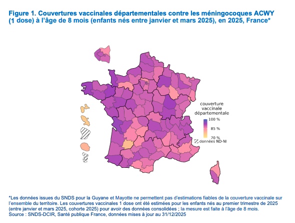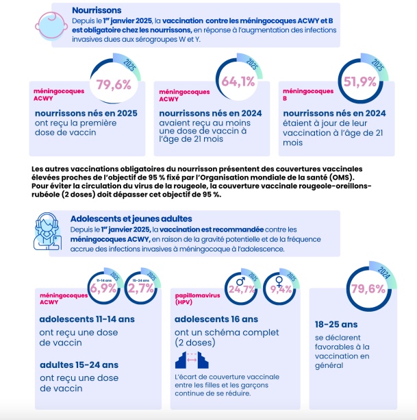 Chez les nourrissons l’obligation vaccinale contre les méningocoques ACWY mise en place depuis le 1er janvier 2025 chez les nourrissons suite à l’augmentation des cas d’infections invasives à méningocoques de types W et Y, a permis d’atteindre une couverture vaccinale élevée avec près de 79,6 % des nourrissons nés en 2025 ayant reçu la première dose de vaccin contre les méningocoques ACWY.