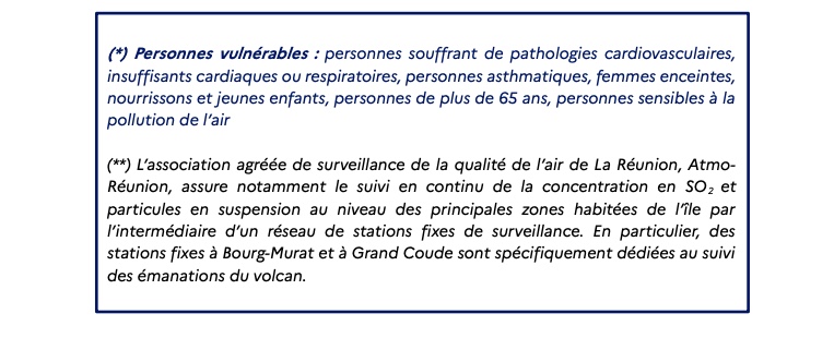 La situation est susceptible d’évoluer rapidement à tout moment compte tenu de l’activité volcanique et de la météorologie. Pour plus d’informations, consultez régulièrement le site internet d’Atmo Réunion afin de suivre l’évolution de la qualité de l’air.