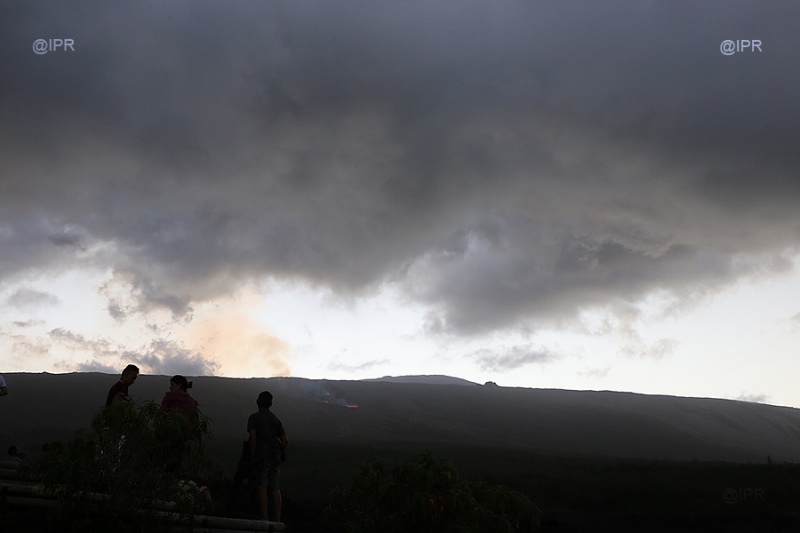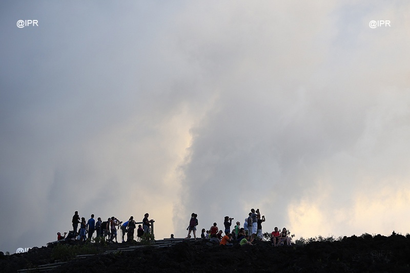 L'éruption du Piton de la Fournaise attire de nombreuses personnes ce lundi 19 mai 2015 sur la route des laves. Plus d'une centaine de touristes et de Réunionnais se sont massés sur la RN2 pour apercevoir les coulées de lave du volcan.