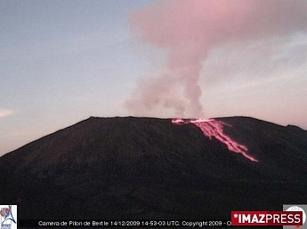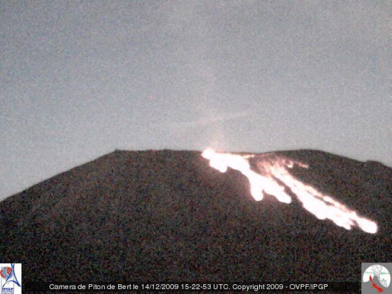 Le piton de la Fournaise est entré en éruption ce lundi 14 décembre 2009 vers 18 heures 45. Les scientifiques de l'observatoire volcanologique sont en cours de localisation du phénomène. Selon les premières informations, une bouche éruptive s'est ouverte sur le flanc Sud du Piton. Des coulées de lave déferlent sur la pente Sud à l'intérieur de l'enclos. L'explosion de lave a eu lieu quasiment sans préavis. Une crise sismique et des déformations du sommet ont commencé à 17 heures 30. Une crise de trémor a débuté à18 heures 30. Un quart d'heure plus tard, la lave crevait la surface.