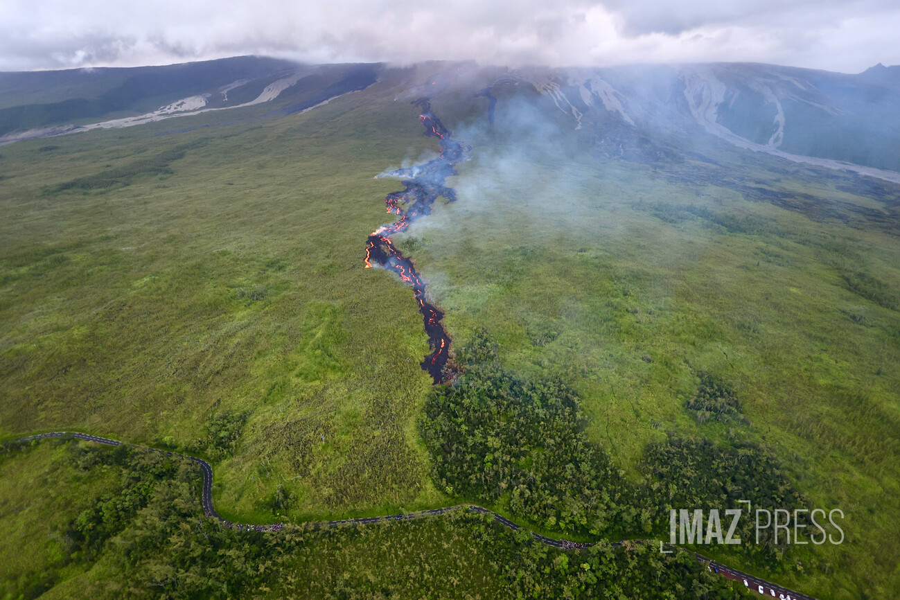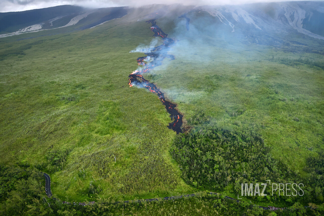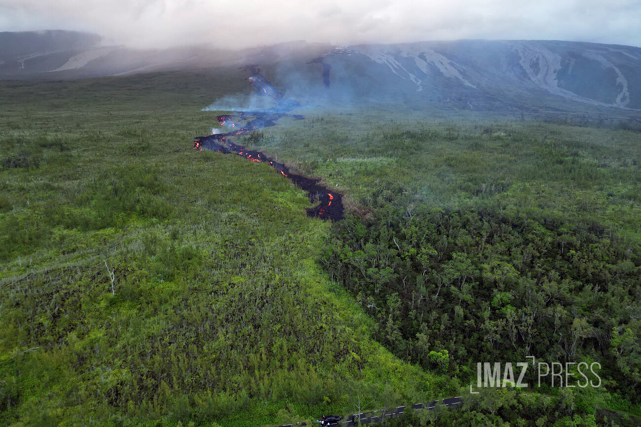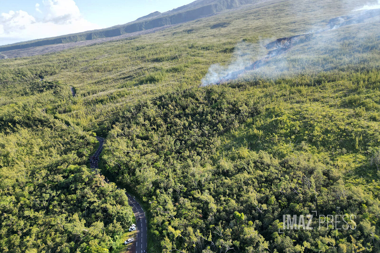 Notre photographe a pu survoler la coulée de lave, qui se rapproche doucement de la route. Regardez :