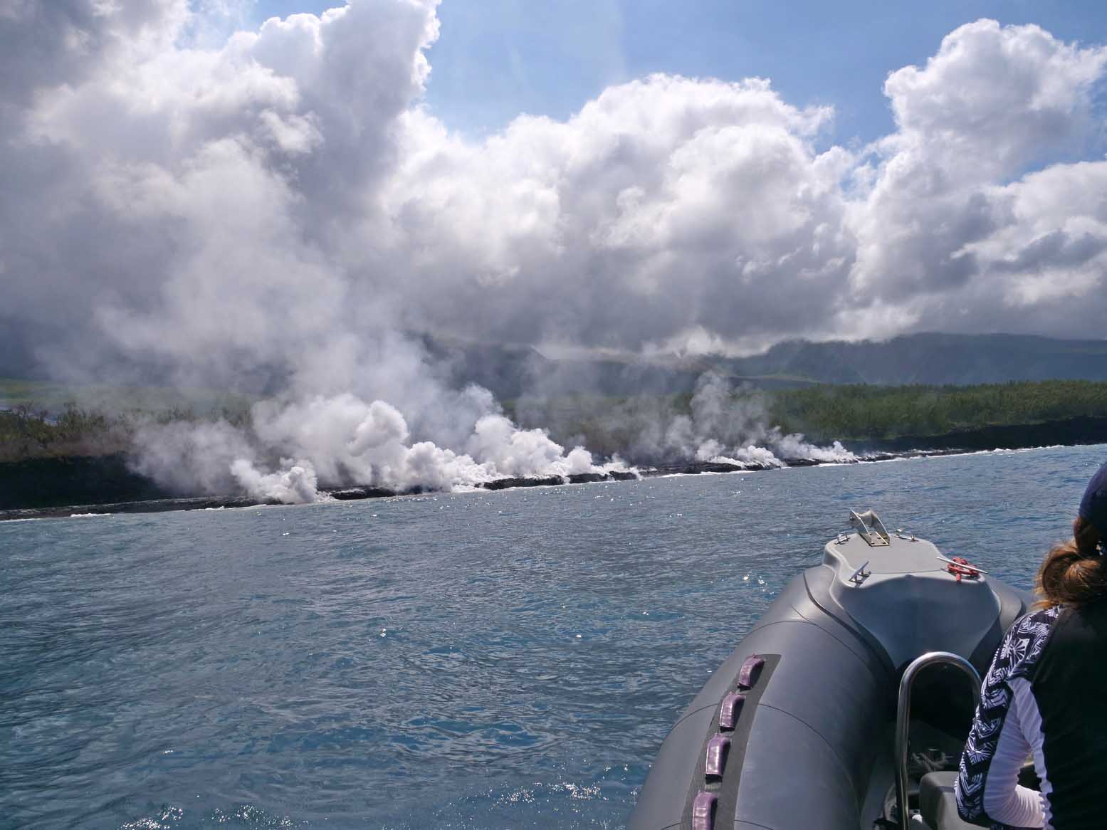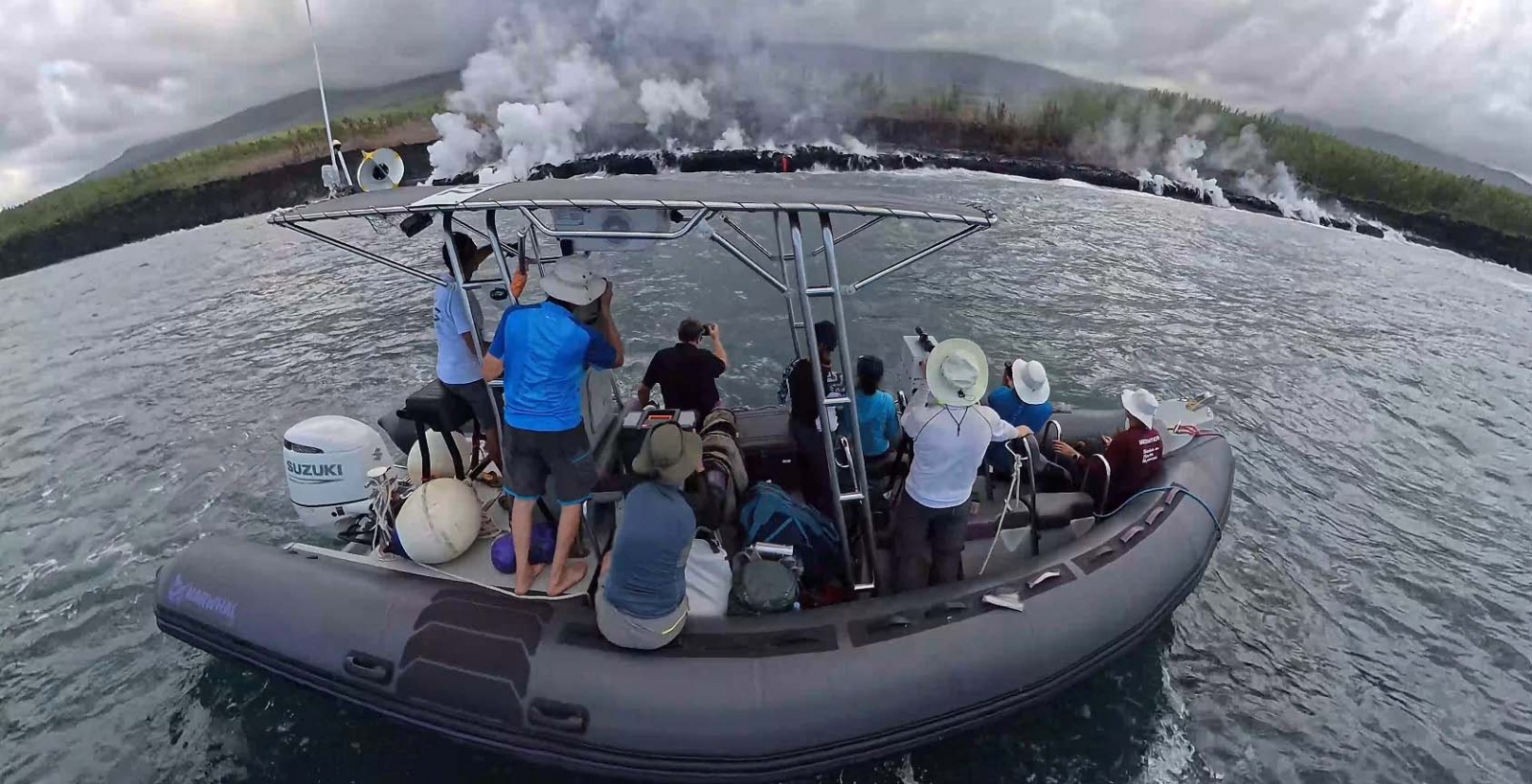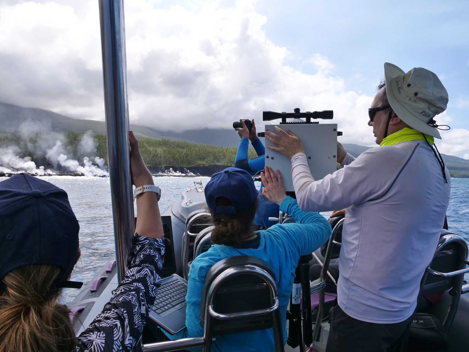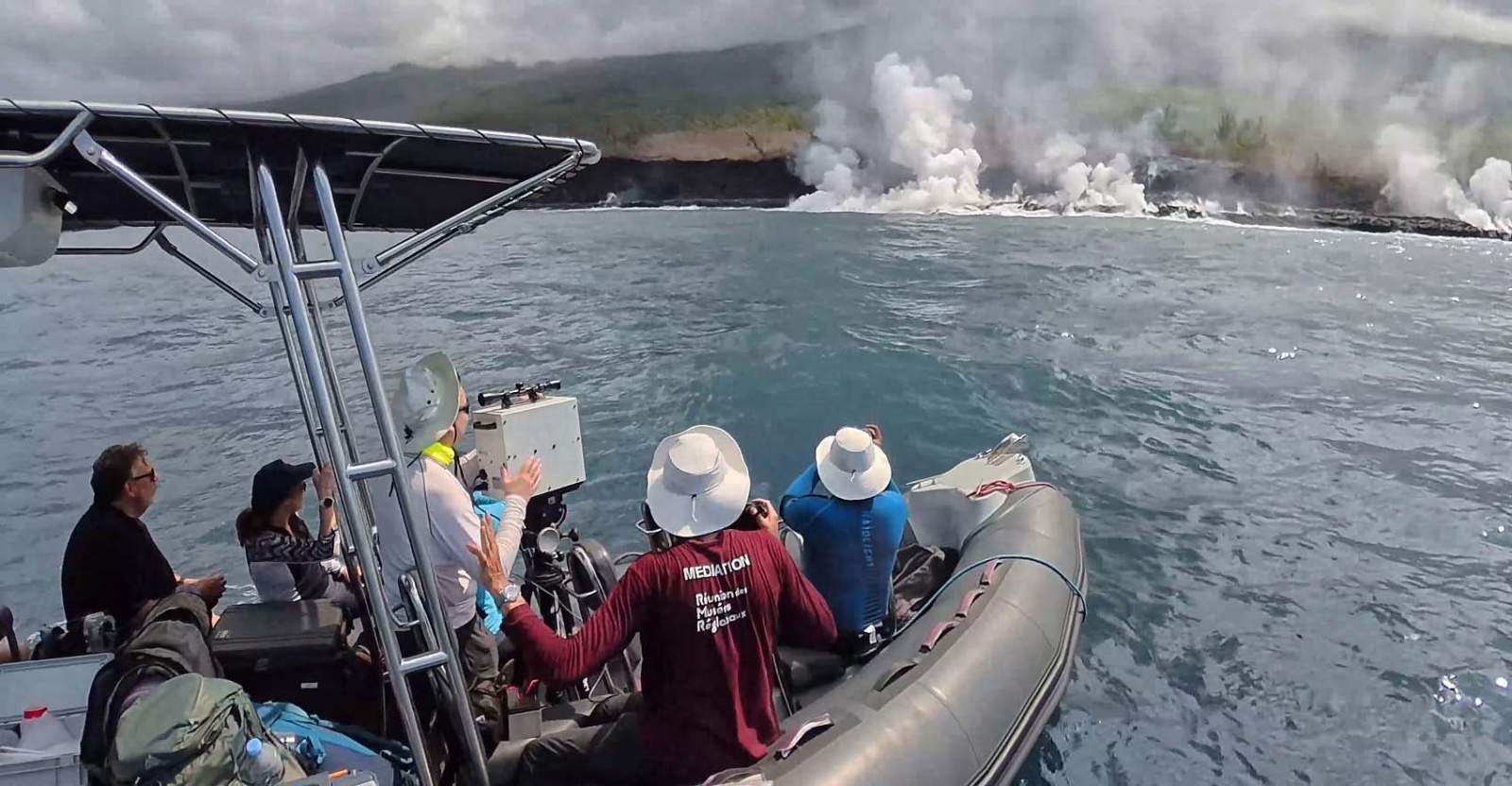 Une fumée importante se soulevait encore lorsqu'une équipe pluridisciplinaire de scientifiques a pu s'approcher de la plateforme de lave formée au niveau de l’entrée en mer, au large de Sainte-Rose. À bord d'un bateau semi-rigide, géologues, géochimistes et spécialistes du programme Biolave ont effectué une première reconnaissance de la zone.