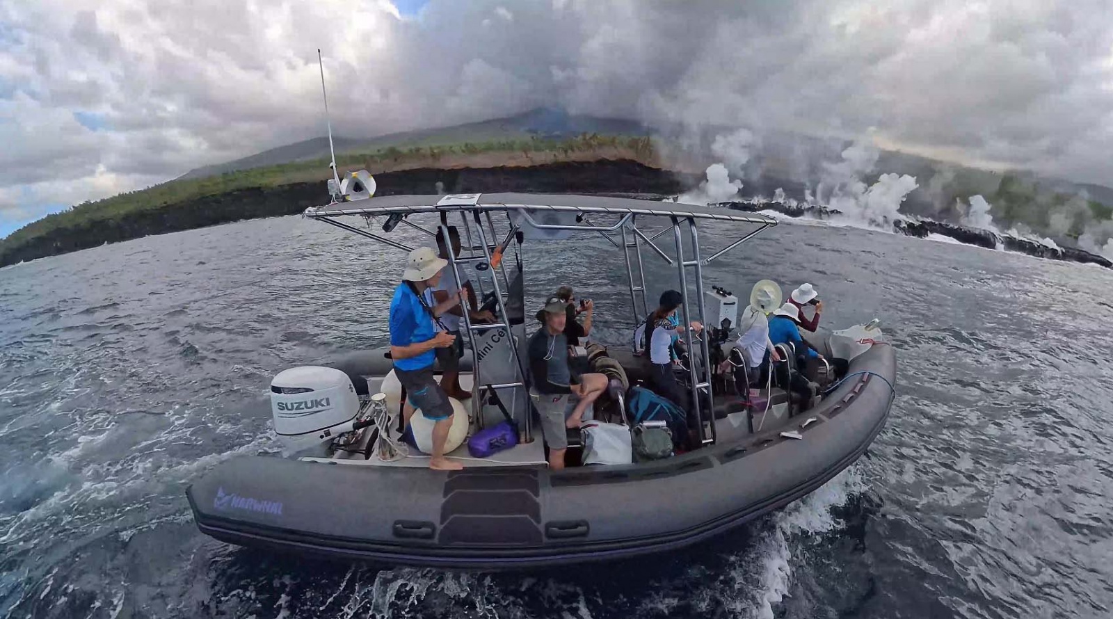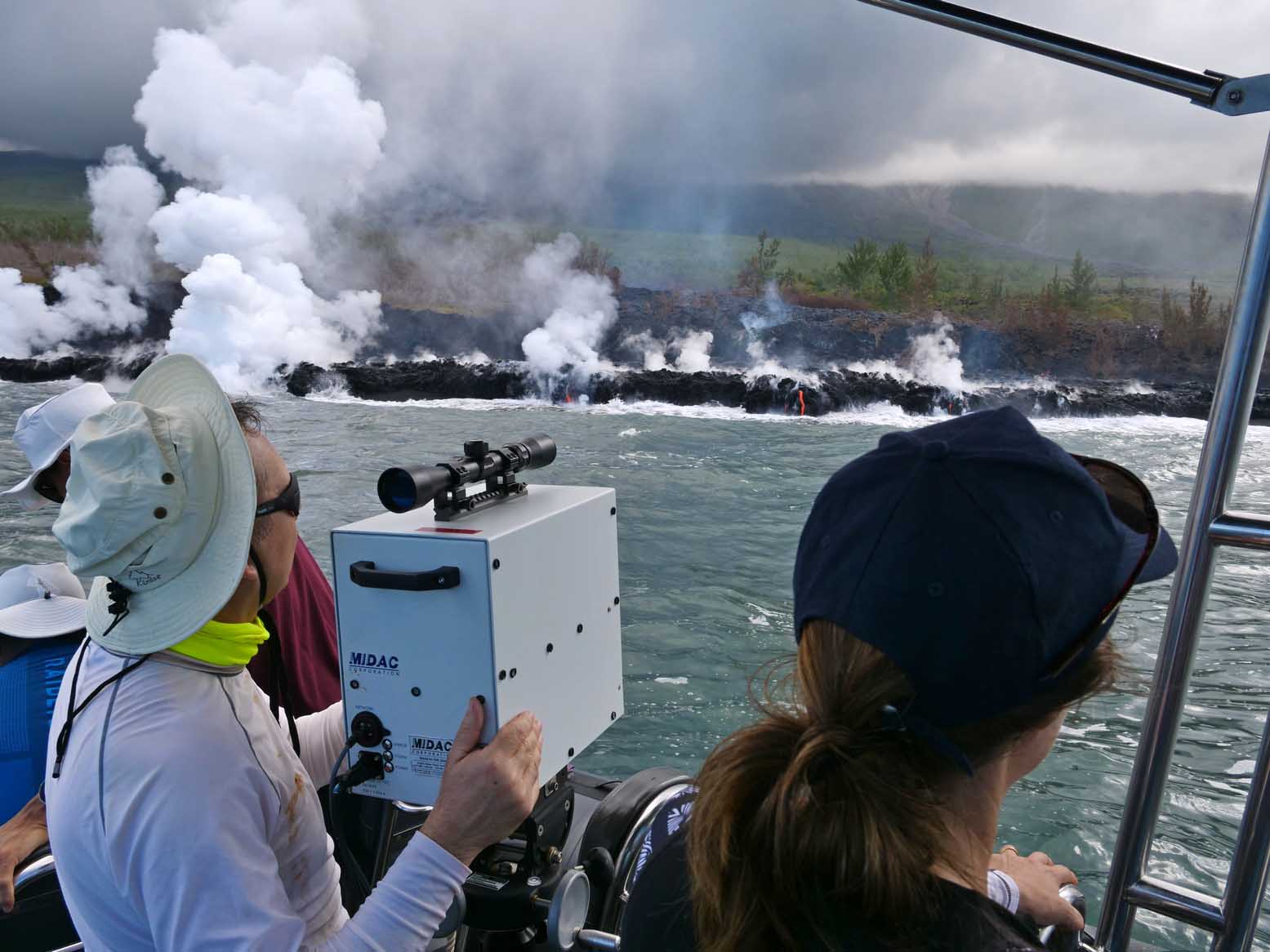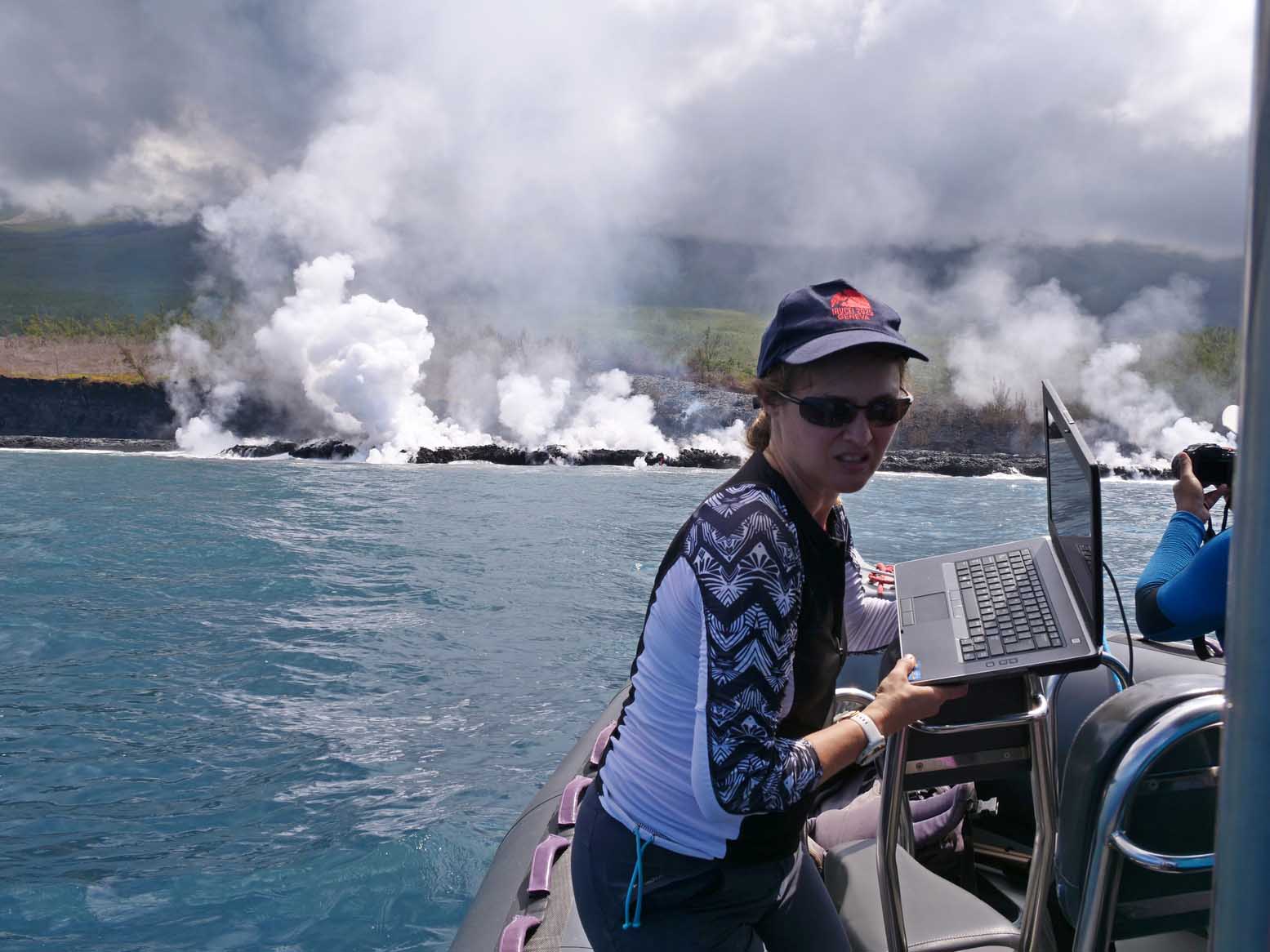Une fumée importante se soulevait encore lorsqu'une équipe pluridisciplinaire de scientifiques a pu s'approcher de la plateforme de lave formée au niveau de l’entrée en mer, au large de Sainte-Rose. À bord d'un bateau semi-rigide, géologues, géochimistes et spécialistes du programme Biolave ont effectué une première reconnaissance de la zone.