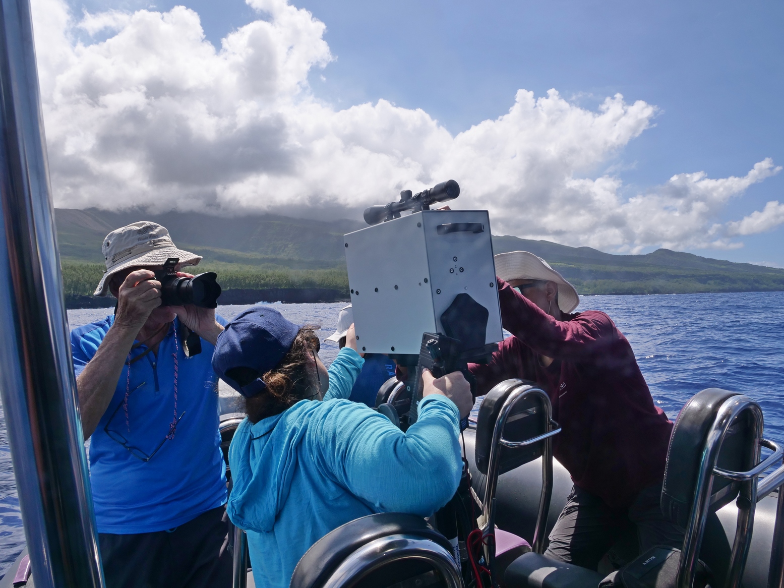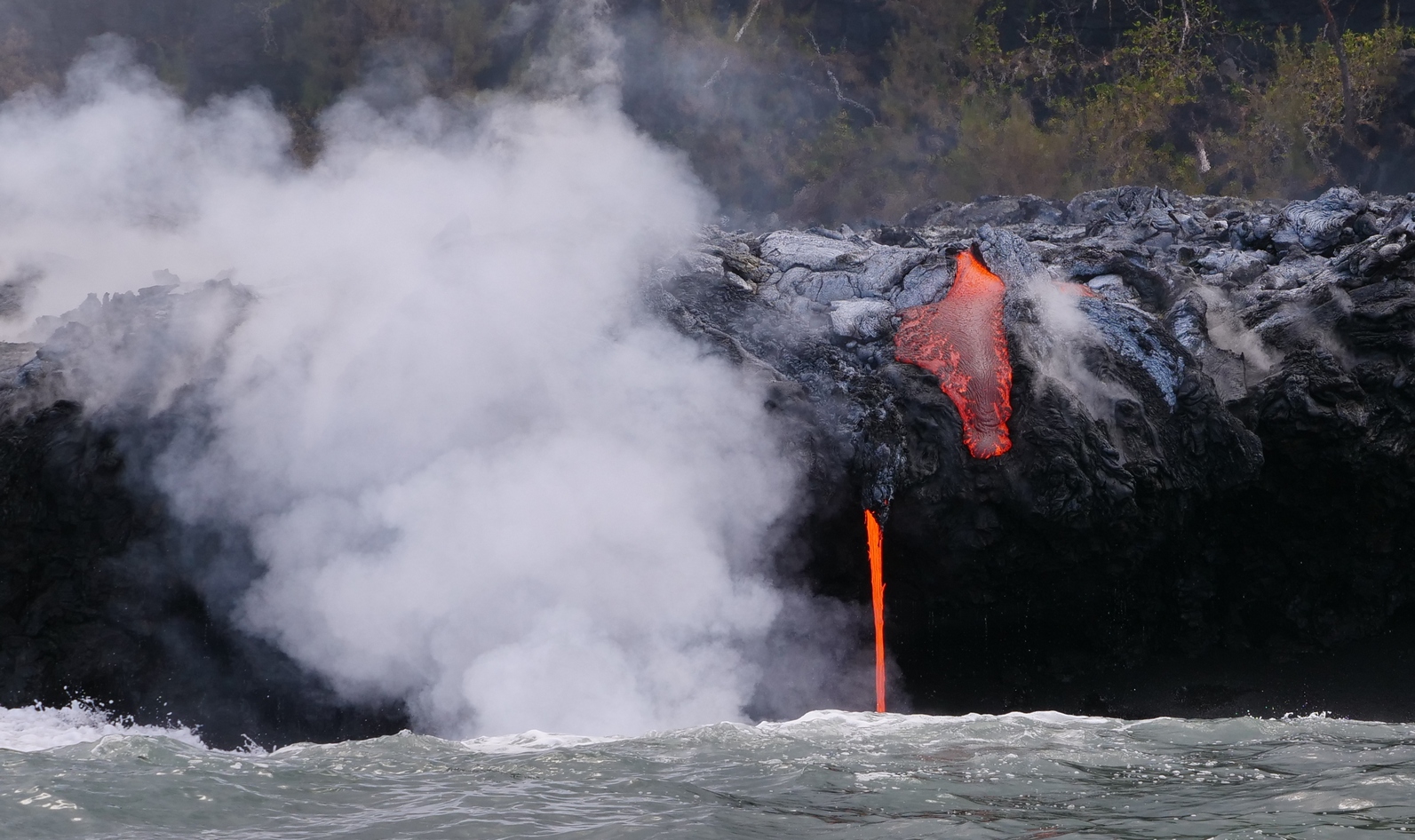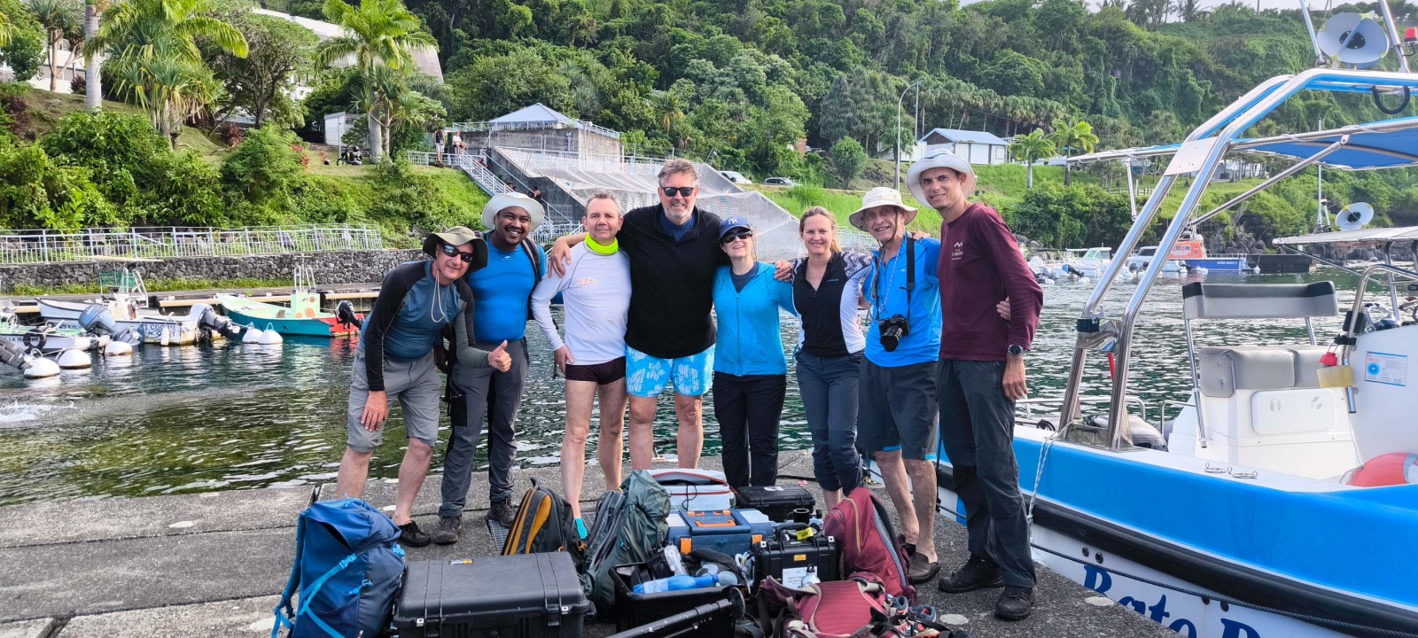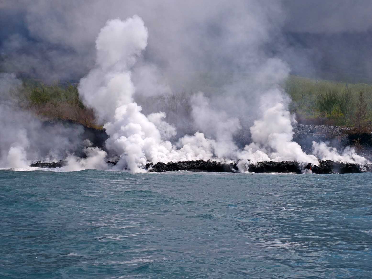 Une fumée importante se soulevait encore lorsqu'une équipe pluridisciplinaire de scientifiques a pu s'approcher de la plateforme de lave formée au niveau de l’entrée en mer, au large de Sainte-Rose. À bord d'un bateau semi-rigide, géologues, géochimistes et spécialistes du programme Biolave ont effectué une première reconnaissance de la zone.