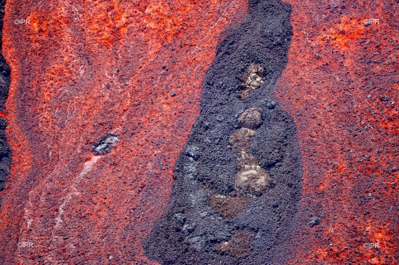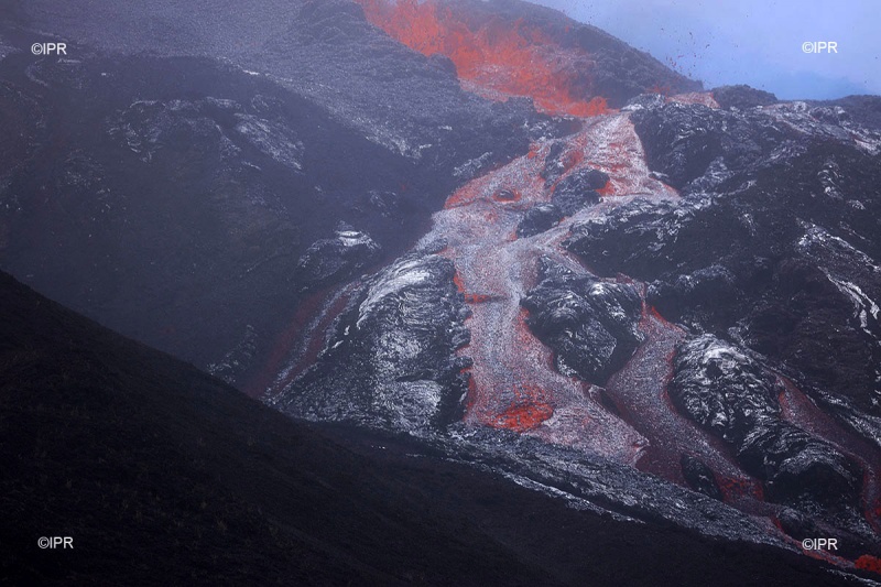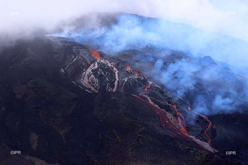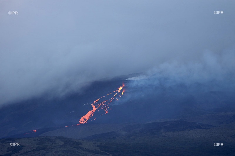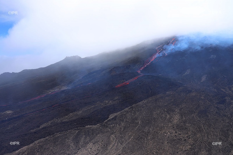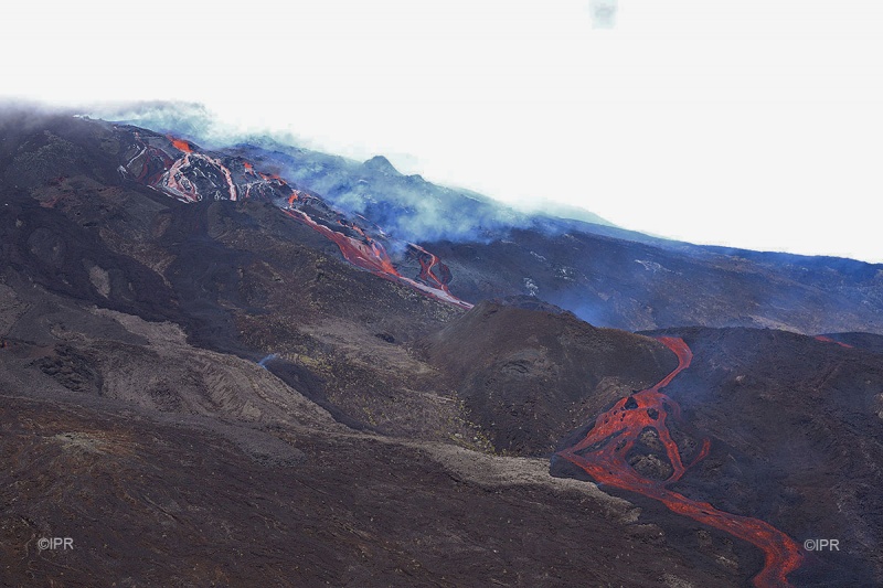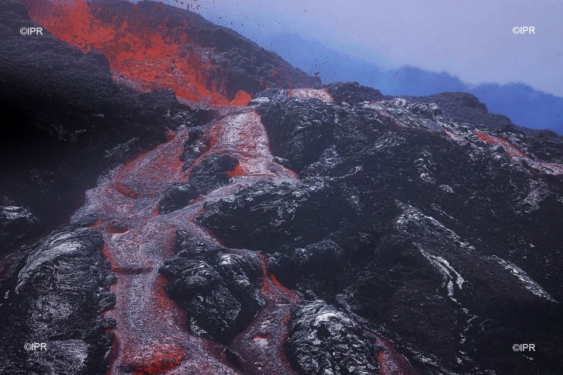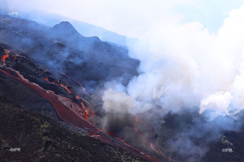 L’ensemble de ces fissures s’étend sur une distance d’un km environ. Lors du survol (13h-13h30 environ), les fontaines de lave ne dépassaient pas les 10 mètres de hauteur. Du fait de la localisation des fissures éruptives et des fortes pentes dans le secteur, les coulées de lave avaient atteint à 13h15 heure locale 1700 m d’altitude et le front de coulée se situait à moins de 150 mètres du cassé des grandes pentes. Néanmoins le front de coulée était fortement ralenti par une zone de replat.