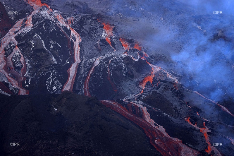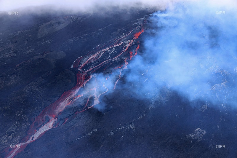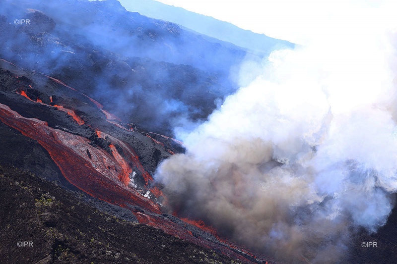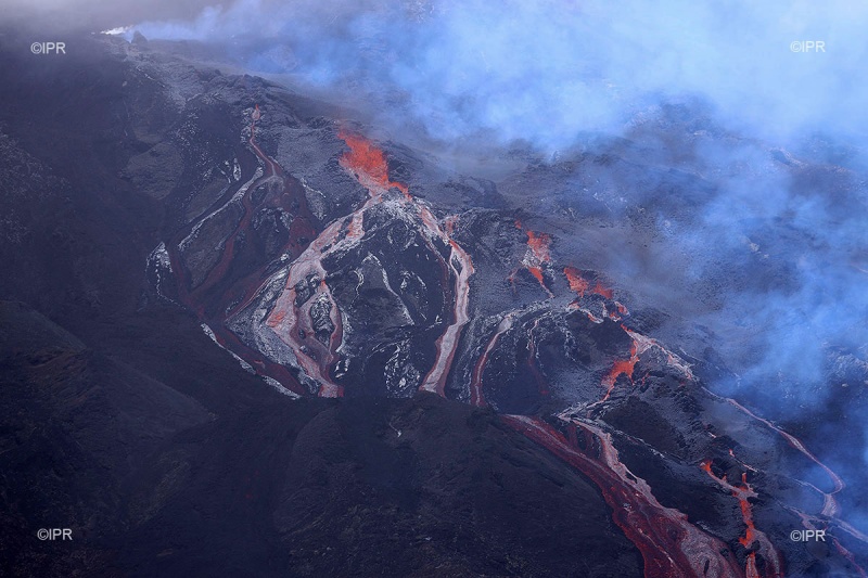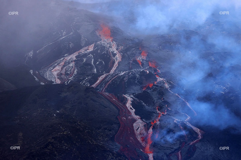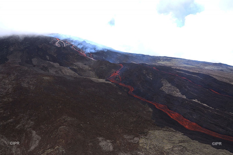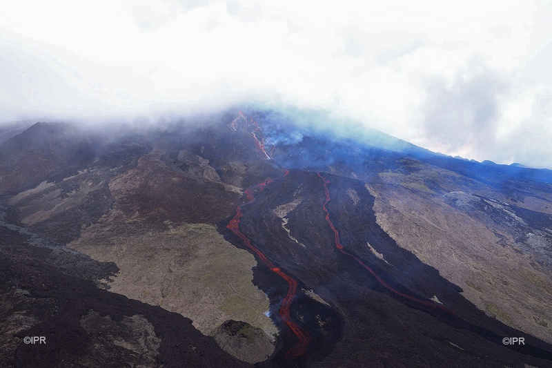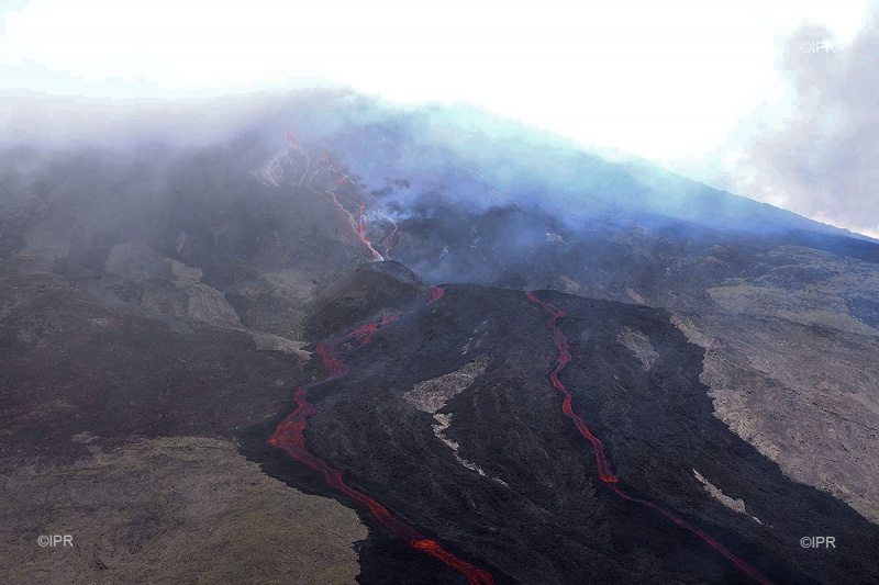 Plusieurs fissures se sont ouvertes sur le flanc est du #PitondelaFournaise entre la zone sommitale et 2000 m d'altitude. Les fontaines de lave ne dépassent pas 10 m de hauteur. Reconnaissance faite vers 13h30 avec le soutien d'Imaz Press Réunion @ipreunion. (Images ©OVPF/IPGP) pic.twitter.com/Rs93FXEbpK