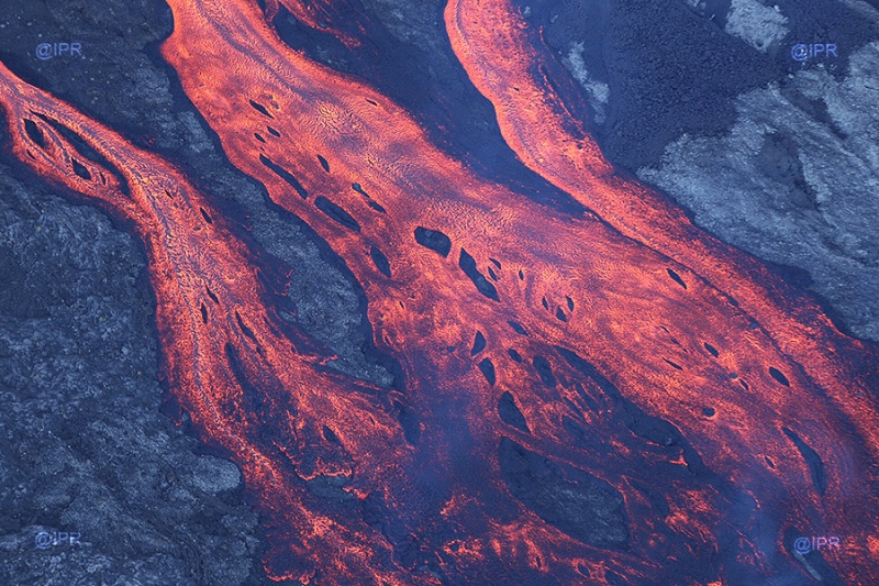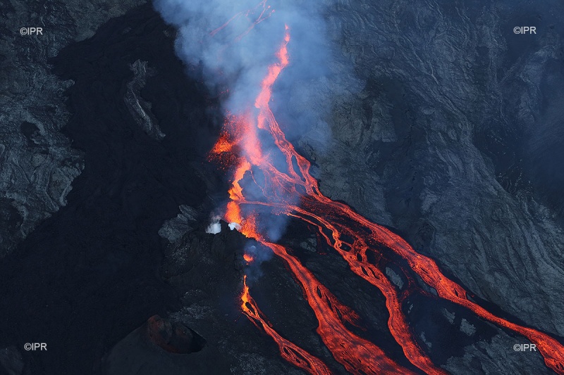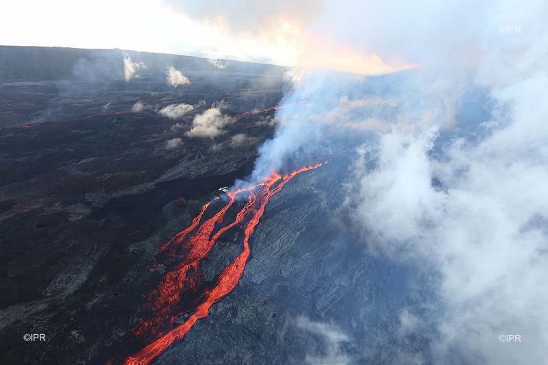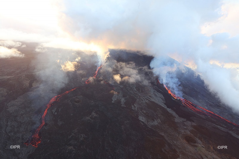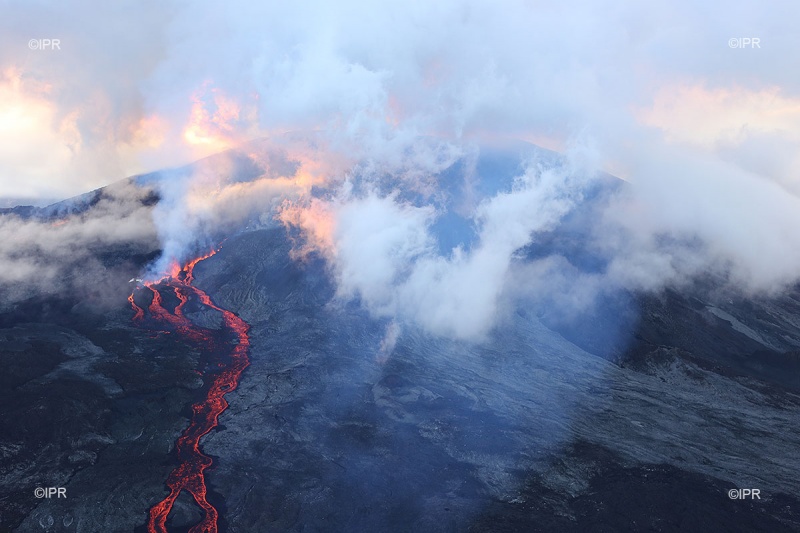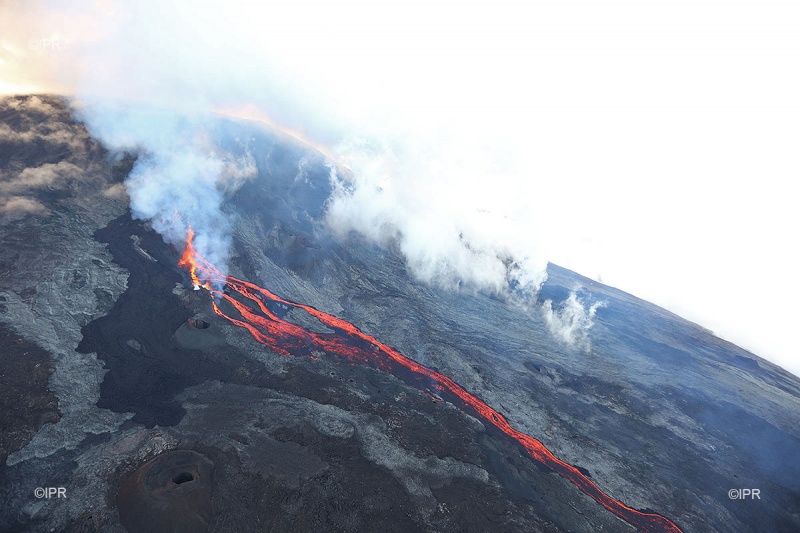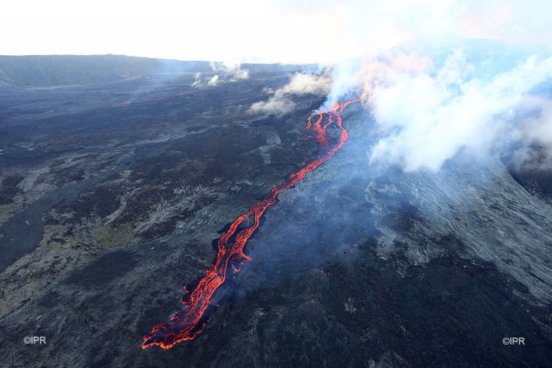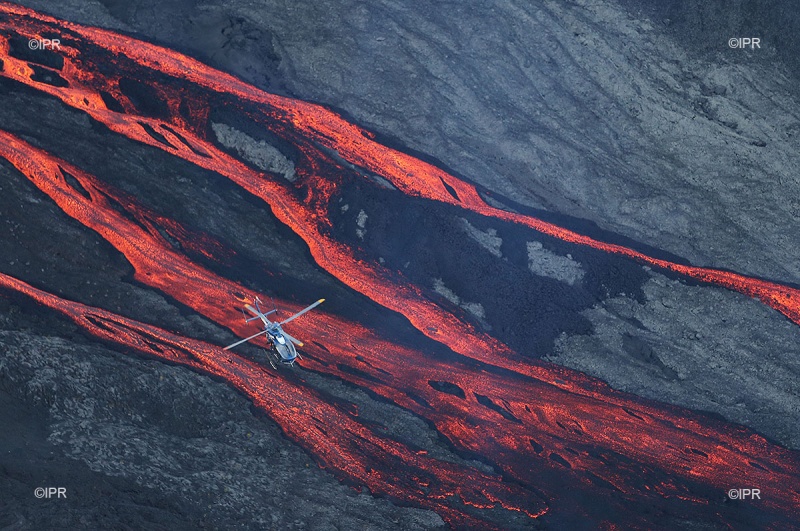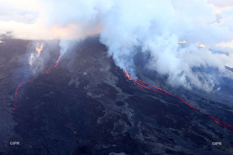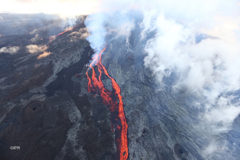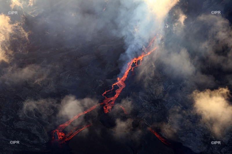 Les nuages qui couvraient le Piton de la Fournaise ce dimanche 17 mai 2015 se sont dissipés au milieu de l'après-midi. L'occasion pour Imaz Press Réunion de monter en hélicoptère pour capturer les premières images de l'éruption et des deux coulées de laves. Le volcan s'est réveillé à 13h45 après une crise sismique de près d'une heure.