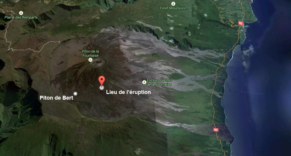 Le phénomène a lieu dans l'enclos sur le flanc est-sud-est du cône central, près de Château Fort. Comme en février dernier, la coulée de lave peut être observée depuis le piton de Bert, également appelé Piton Bois Vert.