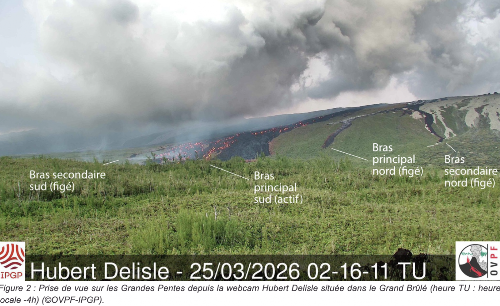 Le champ de lave dessine deux bras principaux se divisant en bras secondaires. Sur les dernières 24 heures, seul le bras principal sud était actif. Les fronts des deux bras nord sont restés figés, situés respectivement à environ 660 mètres d’altitude pour le bras principal nord et 690 mètres pour le bras secondaire nord.