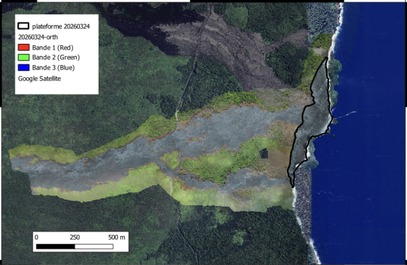 L’éruption débutée le 13 février 2026 se poursuit ce mercredi 25 mars 2026. Un seul site éruptif reste actif sur le flanc sud-sud-est. Seule la coulée principale sud est encore alimentée et continue d’alimenter une plateforme à l’océan, sur laquelle les circulations de lave se font désormais majoritairement en tunnel. Les relevés effectués par l'Observatoire volcanologique sur le terrain ce 24 mars indiquaient une superficie de la plateforme de 8,4 hectares et une avancée de 193 mètres sur l’océan (Photo : Nicolas Villeneuve/www.imazpress.com)