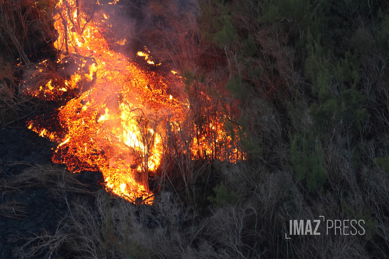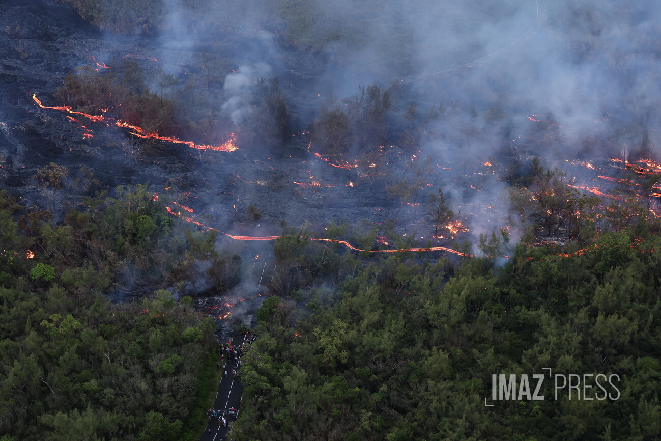 Un mois après le début de l’éruption, le 13 mars à 8h02, la coulée de lave du bras sud a atteint la RN2, située à plus de 7 kilomètres du point d’éruption.