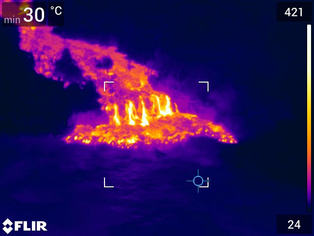 Volant à plus de 2.000 mètres d'altitude, Nicolas Villeneuve a également "observé un panache acide s'échapper des entrées en mer. La lave entrée dans la mer a transformé la vapeur d'eau en chlorure de sodium (NaCl) qui se change en acide chlorhydrique et n'est pas très bon".