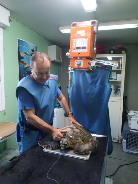 La jeune tortue imbriquée Bellavista a été opérée mercredi 22 août 2018 pour retirer l'hameçon qu'elle avait ingéré. Celui-ci s'était planté au début de l'oesophage et dans les muscles du cou, ce qui a rendu l'opération assez délicate. La jeune tortue a donc dû être opérée sous anesthésie générale.