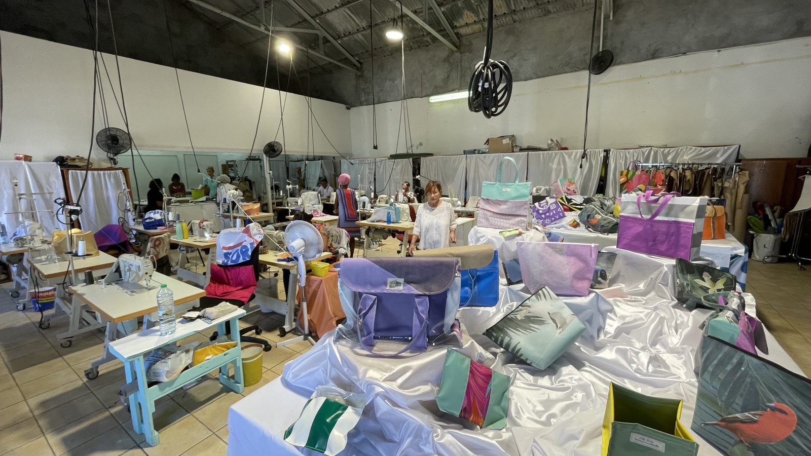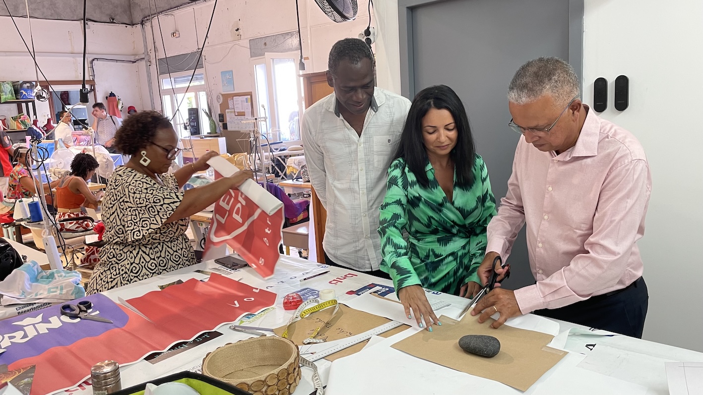 Douze agents en Contrat à durée déterminée d’insertion (CDDI) y travaillent dans un espace de 170 m² équipé de machines à coudre, tables de coupe et zone d’exposition.