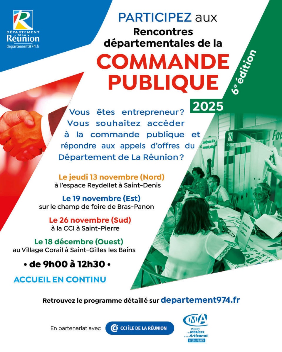 Le Département de La Réunion et la CCIR organisent les rencontres départementales de la Commande Publique, un évènement pour les chefs d’entreprise qui souhaitent accéder à la commande publique et répondre aux appels d’offres du Département de La Réunion. Première étape, le jeudi 13 novembre 2025 à l’Espace Reydellet, à Saint-Denis. Nous publions le programme complet ci-dessous. (Photo : sly/www.imazpress.com)