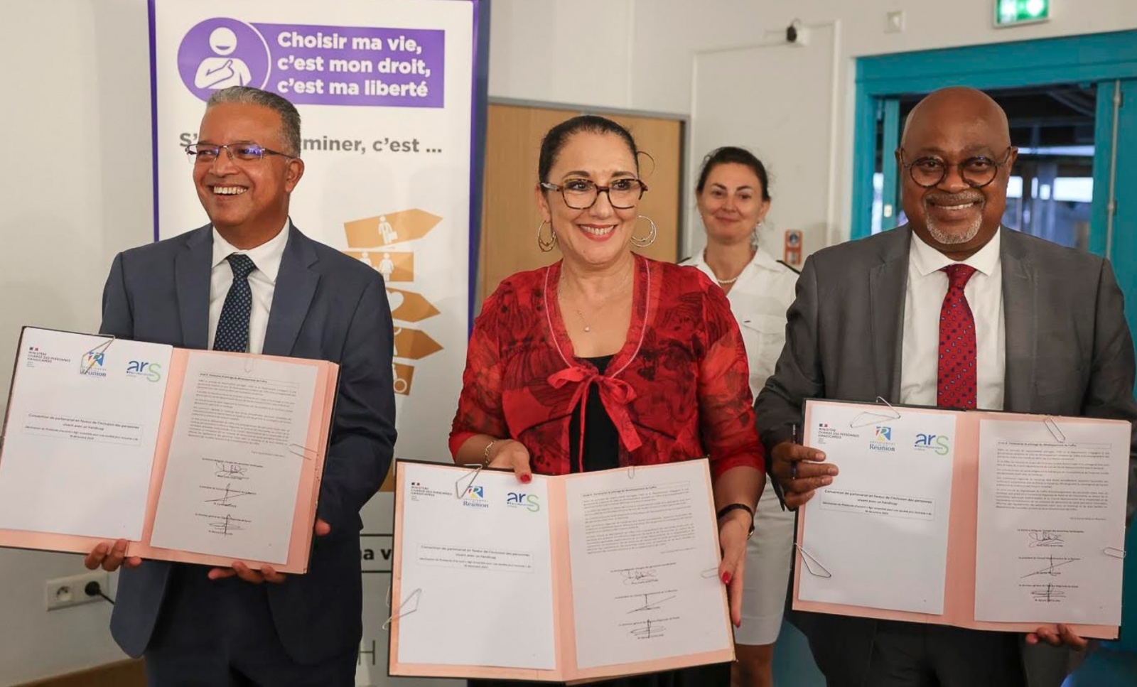 Une convention en faveur des personnes vivant avec un handicap a été signée, vendredi 10 novembre, à Sainte-Marie, par Fadila Khattabi, ministre chargée des personnes handicapées, Cyrille Melchior, président du Conseil départemental de La Réunion et Gérard Cotellon, directeur général de l’Agence régionale de santé (ARS).