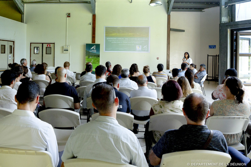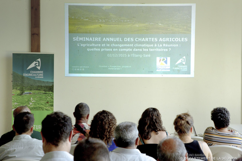 Ce mardi 2 décembre 2025 les acteurs agricoles, collectivités et experts se sont réunis à l’Étang-Salé pour le séminaire annuel des Chartes agricoles, consacré à l’impact du changement climatique sur l’agriculture réunionnaise. (Photo : Département)