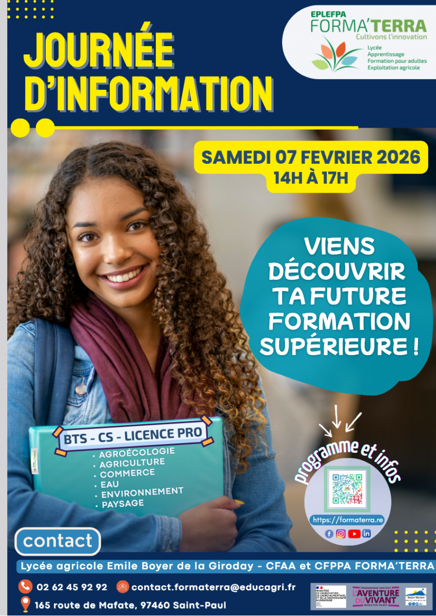 Forma'terra organise une journée d’information consacrée aux formations supérieures le samedi 7 février 2026 de 14h à 17h au lycée agricole Emile Boyer de la Giroday à Saint-Paul. Cet événement vise à informer les visiteurs sur les formations supérieures proposées par l'établissement pour des métiers qui recrutent : paysage, eau, environnement, agriculture, agroécologie, tourisme vert, commerce, soins aux animaux... Nous publions ci-dessous le communiqué (Photo : sly/www.imazpress.com)