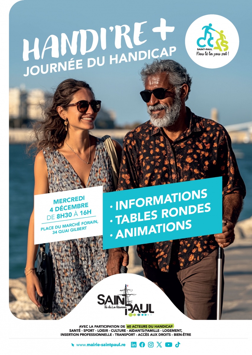 Le mercredi 4 décembre 2024, la ville de Saint-Paul et le Centre communal d'action sociale (CCAS) organisent Handi'Re+, une journée dédiée au handicap. L'événement a lieu de 8h30 à 16 heures sur la place du marché forain. Au programme, des animations et des tables rondes.