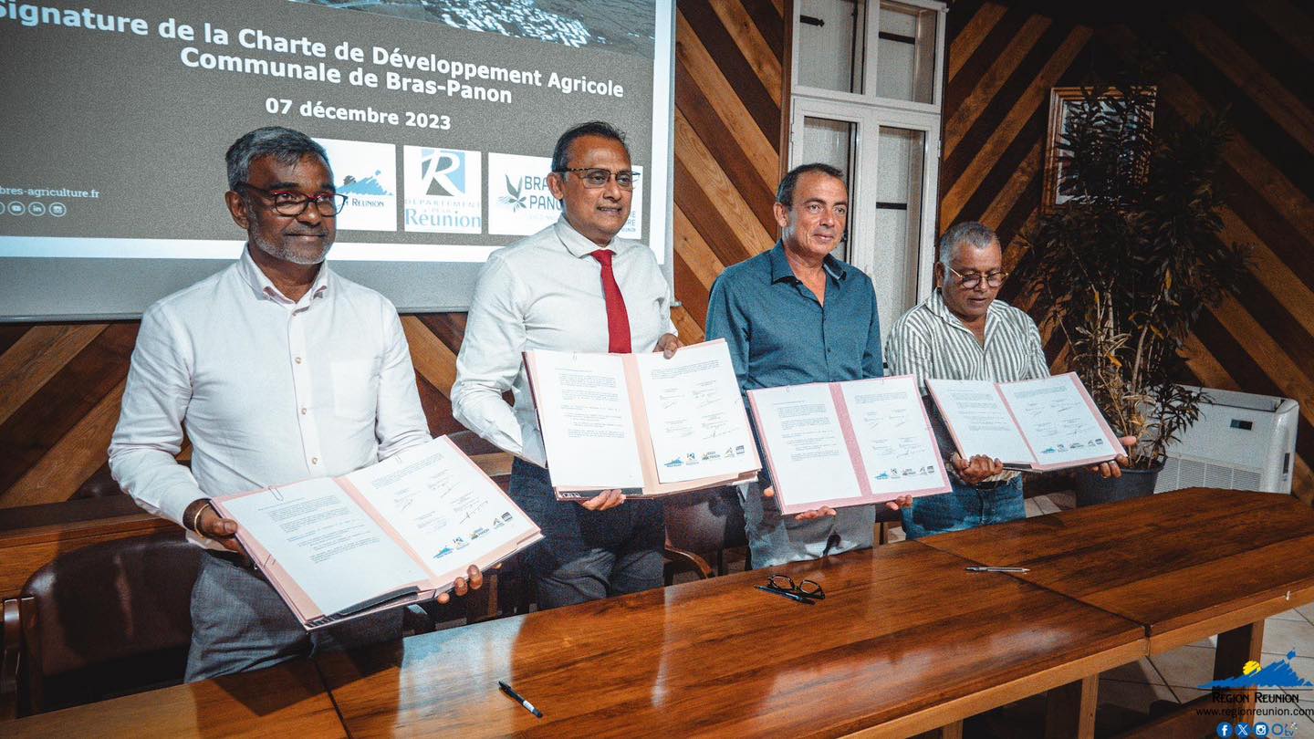 Ce jeudi 7 décembre 2023, Jean-Bernard Maratchia, conseiller régional délégué à l’agriculture, a signé, aux côtés de Jeannick Atchapa, Maire de Bras-Panon, la Charte de développement agricole communale afin de marquer toutes les mesures en faveur du développement agricole sur le territoire, notamment en matière de souveraineté alimentaire. Nous publions leur communiqué ci-dessous (photo : Région Réunion)