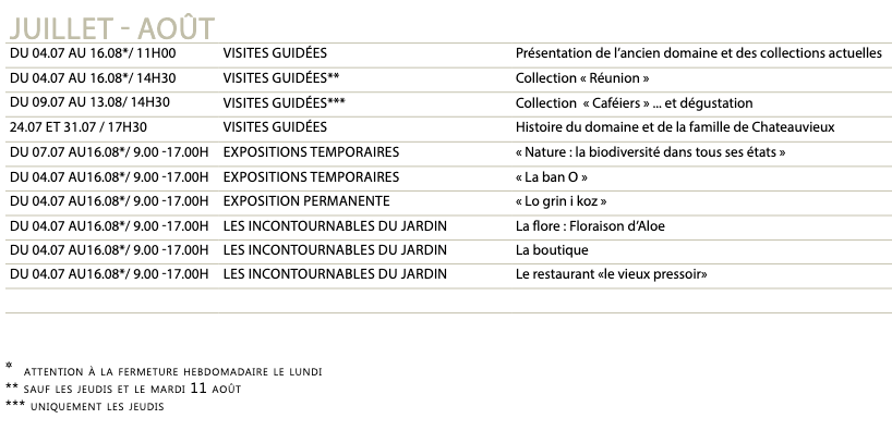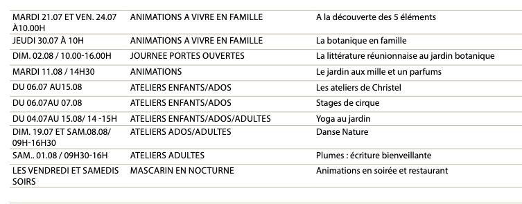 Exposition (Jean-Luc Allègre : " Nature, la biodiversité dans tous ses états "), visites guidées des collections botanique, animations musicales, ateliers, dégustation du café bourbon pointu, …) de nombreuses propositions d’animations vous attendent dans ce jardin à visiter en famille.
