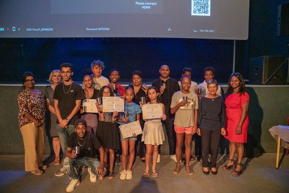 Diffusion des courts métrages sur le grand écran du Cinéma Casino en présence des jeunes acteurs Portois et de quelques parents en guise de conclusion de "Le déclic pour agir, Fonker marmaye". Entre ateliers, repérage, tournage et montage, ce projet aura duré un peu plus d’un an. Les participants ont reçu ce mardi 9 mai 2023, les attestations de participation qui font d’eux des ambassadeurs citoyens de la ville du Port. La remise des attestations a été effectuée par Elise Sautron, maire enfant de la ville, et par les adjointes au maire, Annick Le Toullec et Mémouna Patel, en présence du réalisateur Pierre Beccu. Nous publions ci-dessous le communiqué de la ville du Port. (Photo : Le Port)