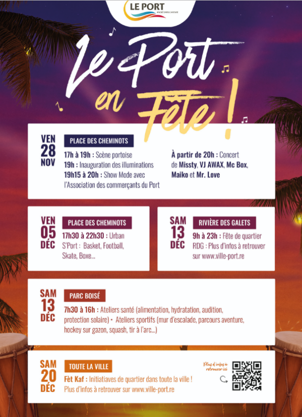 La ville du Port donne le coup d’envoi de l'événement "Le Port en fête" le vendredi 28 novembre 2025 à 19 heures, sur la place des Cheminots. Au programme : inauguration des illuminations, show mode et concerts gratuits. Cet événement marque le début d’un mois de festivités et d’animations culturelles, sportives et familiales proposées dans la ville. (Photo ville du Port)