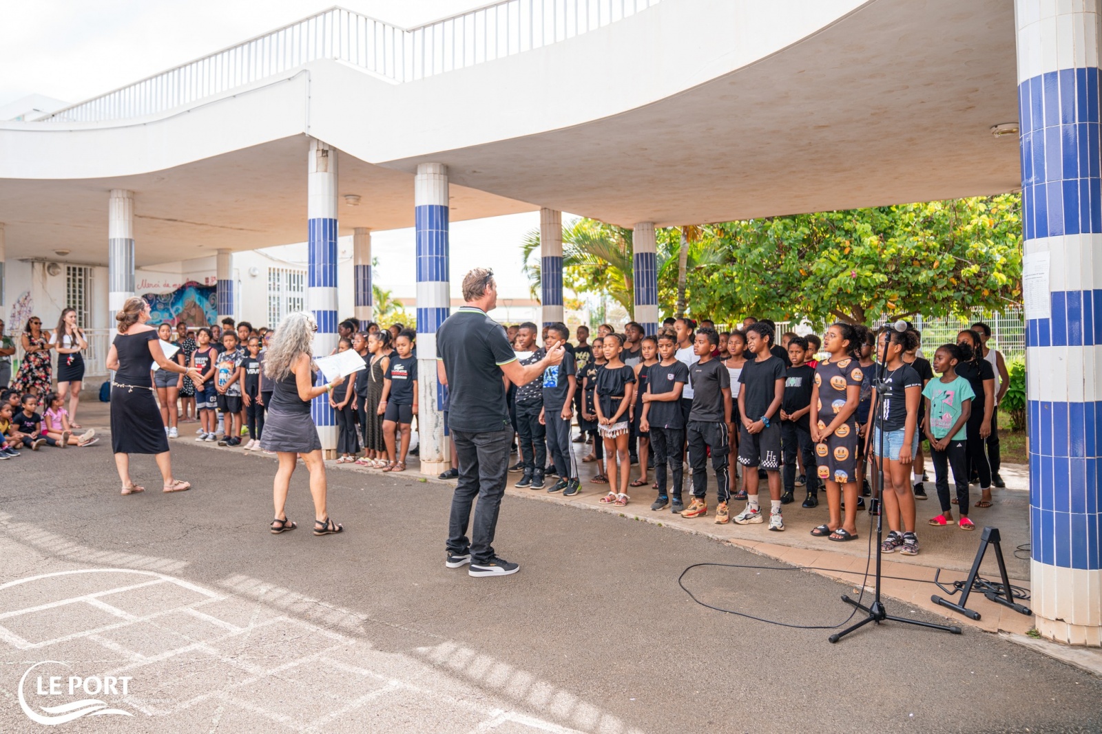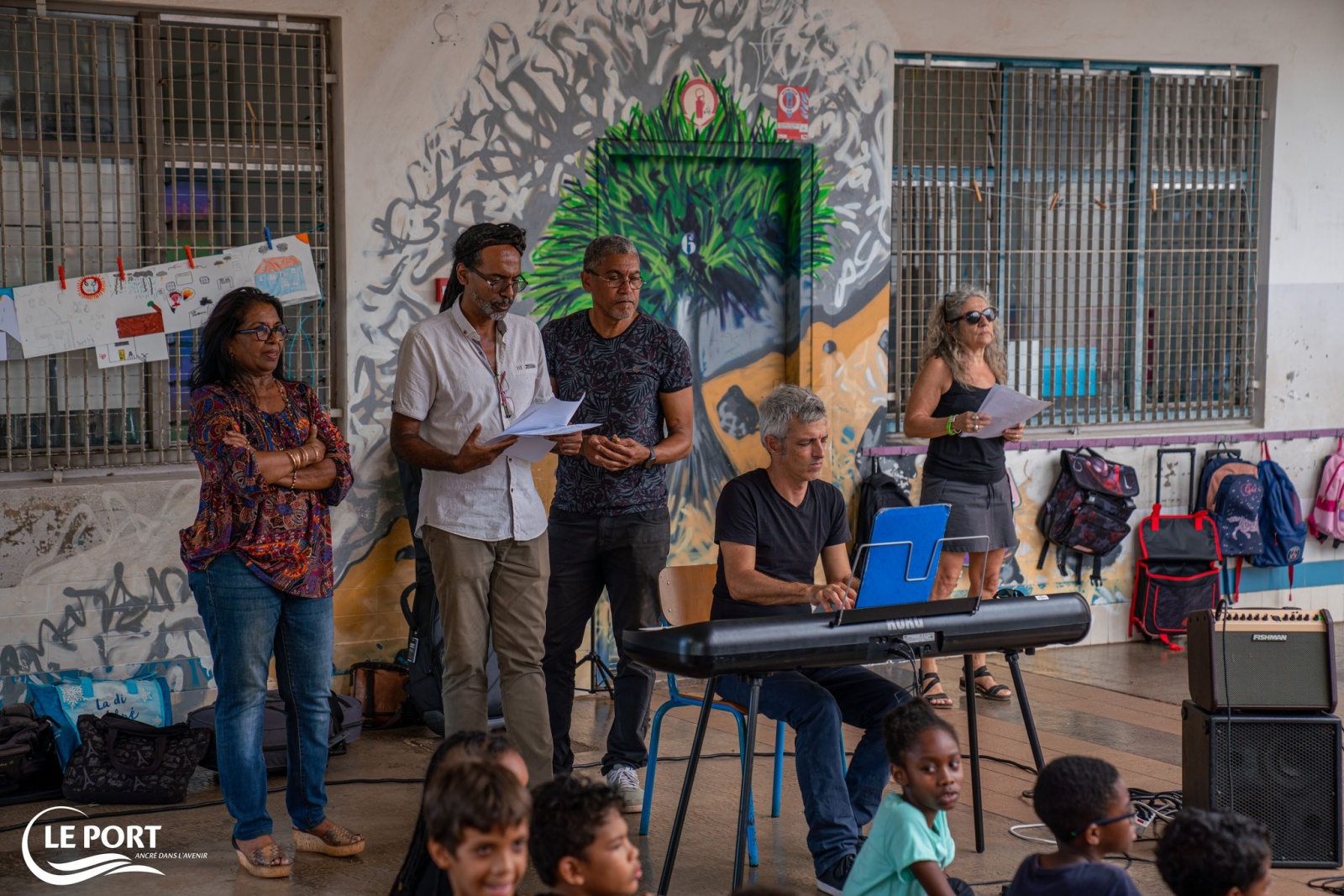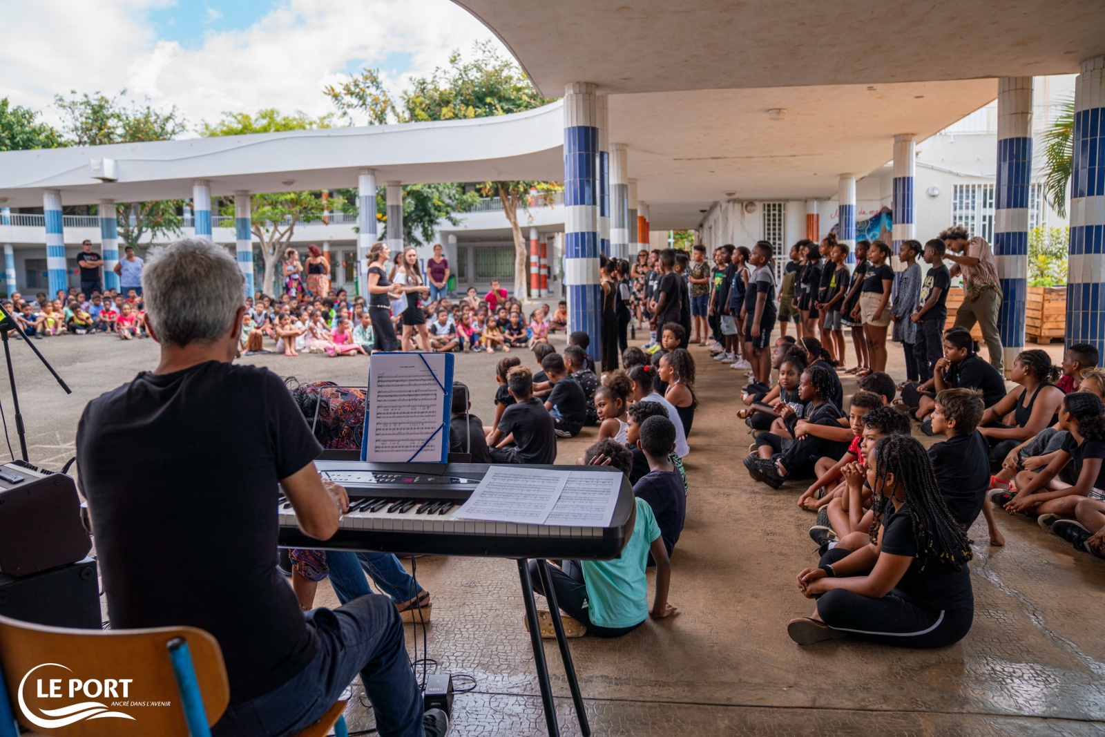 Ce jeudi 7 décembre 2023, dans le cadre de leur projet pédagogique "Action chorale", les élèves de l'école Georges Thiébaut du Port ont pu s'exprimer lors d'un concert au sein de leur établissement. Les artistes Henry Duffour et Tias sont à l'initiative de l'opération notamment portée par le Village titan en collaboration avec l’Éducation nationale et le Kabardock. Les musiciens de jazz, Éric Juan et Christian Chong Wing ont complété le spectacle. (Photos Mairie du Port).