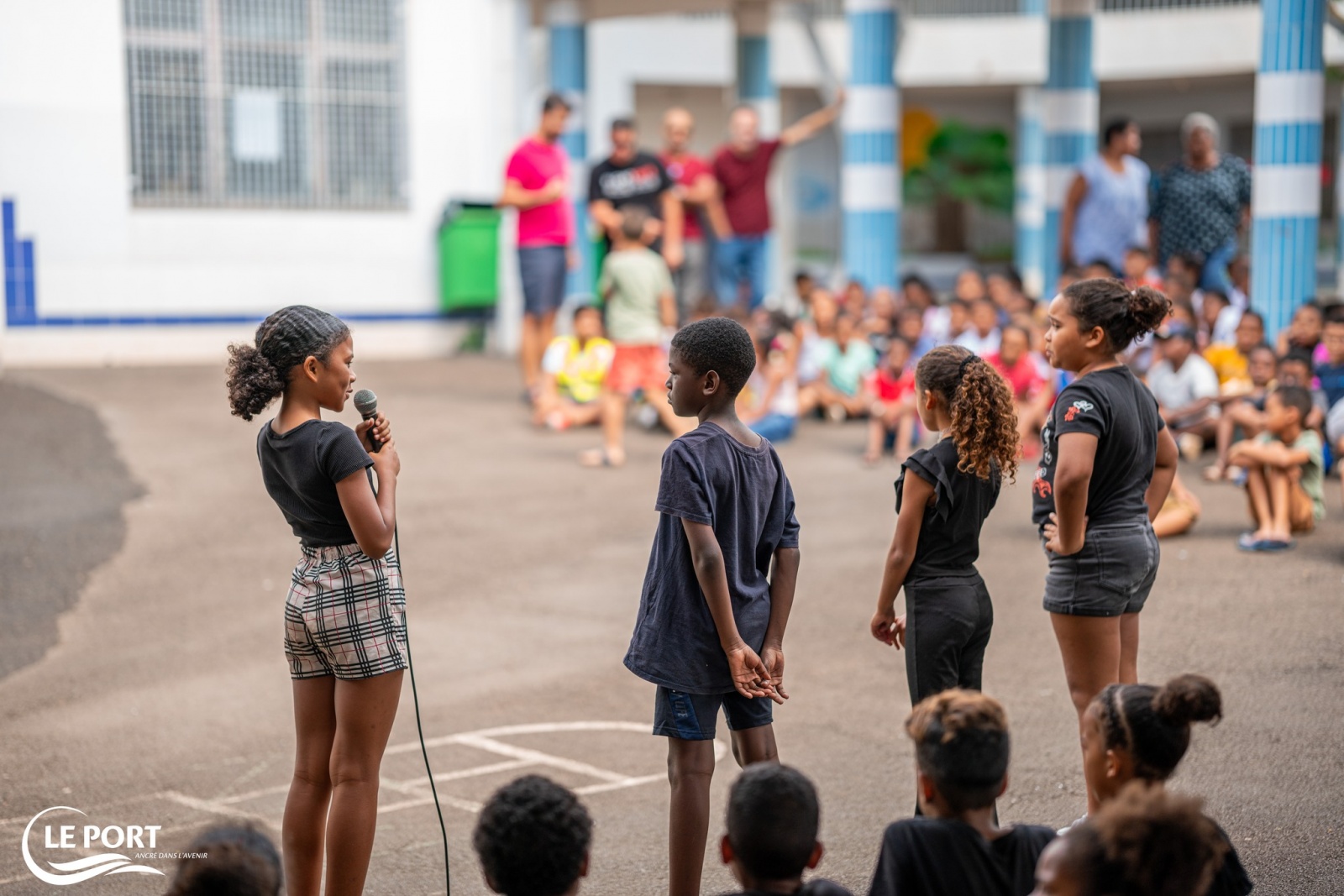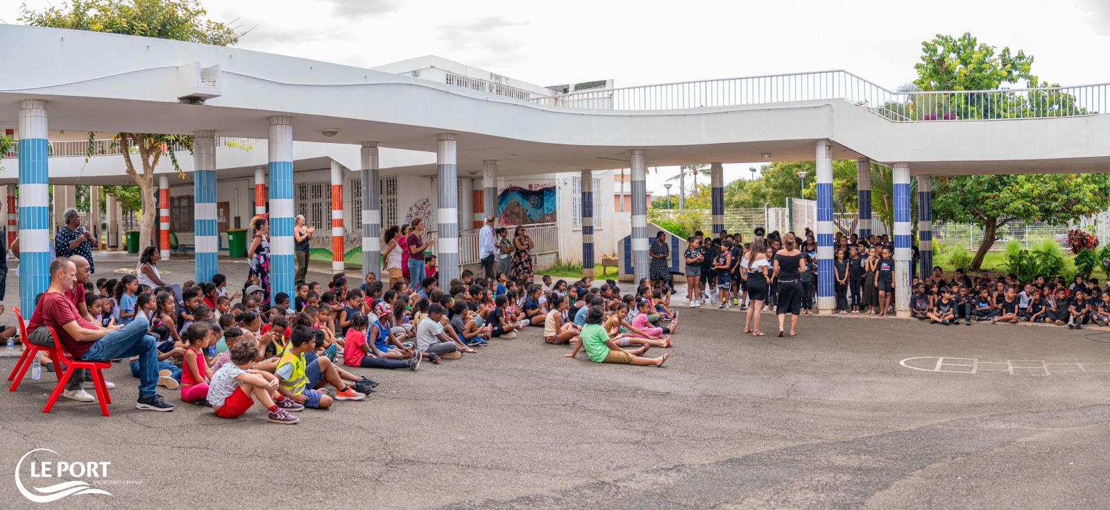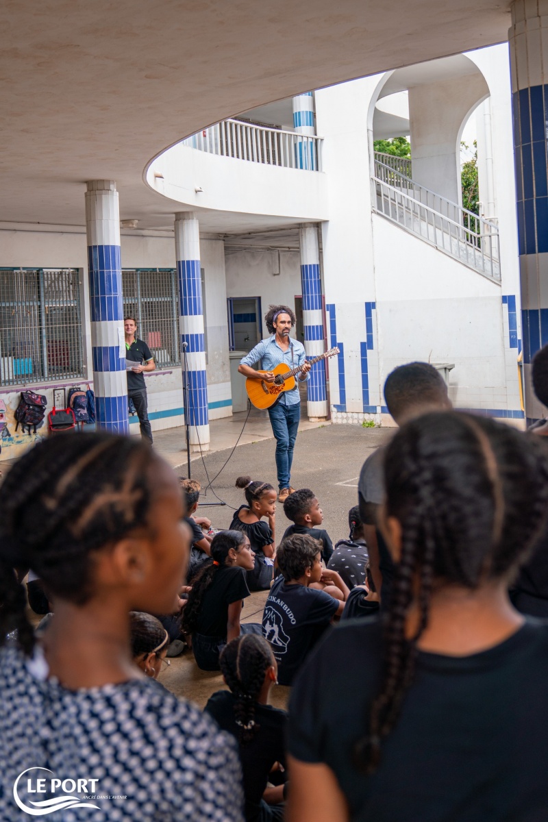 Ce jeudi 7 décembre 2023, dans le cadre de leur projet pédagogique "Action chorale", les élèves de l'école Georges Thiébaut du Port ont pu s'exprimer lors d'un concert au sein de leur établissement. Les artistes Henry Duffour et Tias sont à l'initiative de l'opération notamment portée par le Village titan en collaboration avec l’Éducation nationale et le Kabardock. Les musiciens de jazz, Éric Juan et Christian Chong Wing ont complété le spectacle. (Photos Mairie du Port).