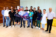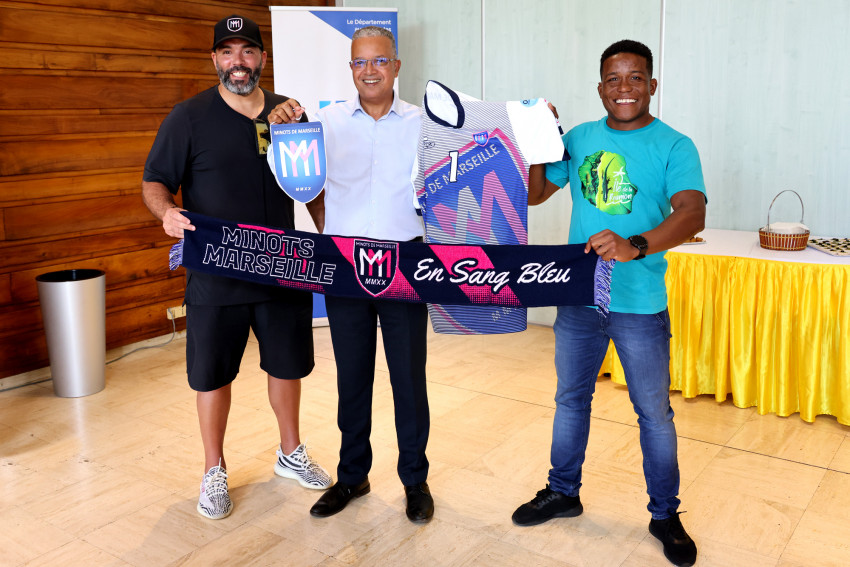 Cyrille Melchior, le Président du Département de La Réunion, a reçu le lundi 11 décembre 2023 les membres de l’équipe de beach soccer "Les Minots de Marseille", une équipe de France dont le réunionnais Jérémy Basquaise est le capitaine. Ils participeront ce vendredi 15 décembre 2023 à un match de gala nocturne de beach soccer à 20h au terrain de sable du Front de mer de Saint-Paul. (Photo : Département)