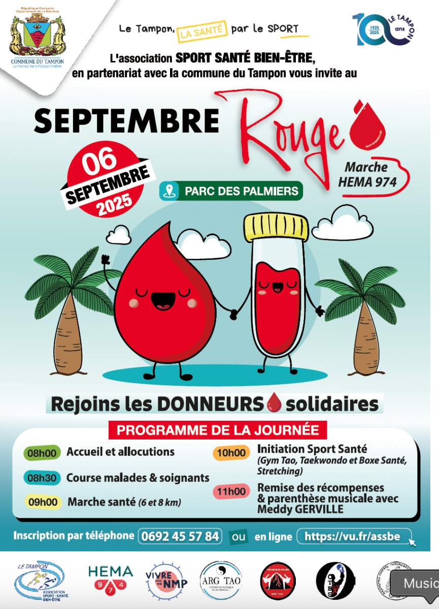 L'association Sport santé bien-être et la commune du Tampon vous convie à un événement exceptionnel pour célébrer le sport et la solidarité : Septembre rouge. L'événement a lieu ce vendredi 6 septembre 2025 au Parc des Palmiers du Tampon (partie haute) pour une matinée remplie d'activités. Nous publions ci-dessous le communiqué (Photo d'illustration : sly/www.imazpress.com)