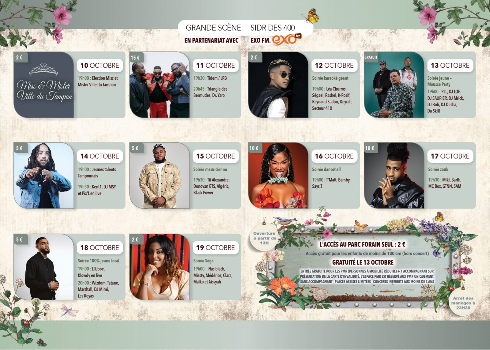 La billeterie est ouverte pour les concerts de cette 41ème édition qui aura lieu du 10 au 19 octobre 2025. Aprés l'élection de miss et mister ville du Tampon, les artistes se succederont sur la scéne.