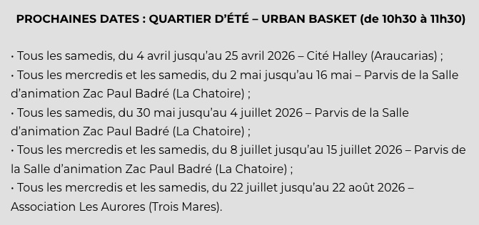 L’Urban Basket s’inscrit dans une programmation plus large portée tout au long de l’année dans plusieurs quartiers du Tampon. Les séances se déroulent chaque samedi, ainsi que les mercredis pendant les vacances scolaires, sur les sites de la Cité Halley (Araucarias), le Parvis de la Salle d’animation Zac Paul Badré (La Chatoire) et de l’Association Les Aurores (Trois Mares).